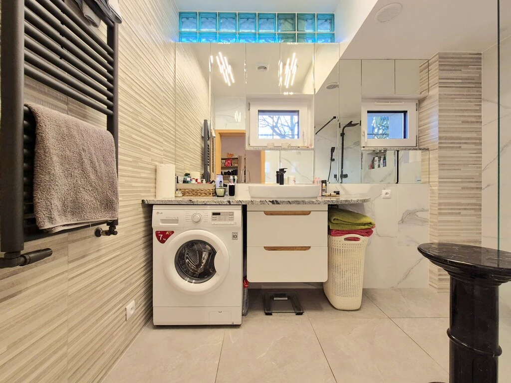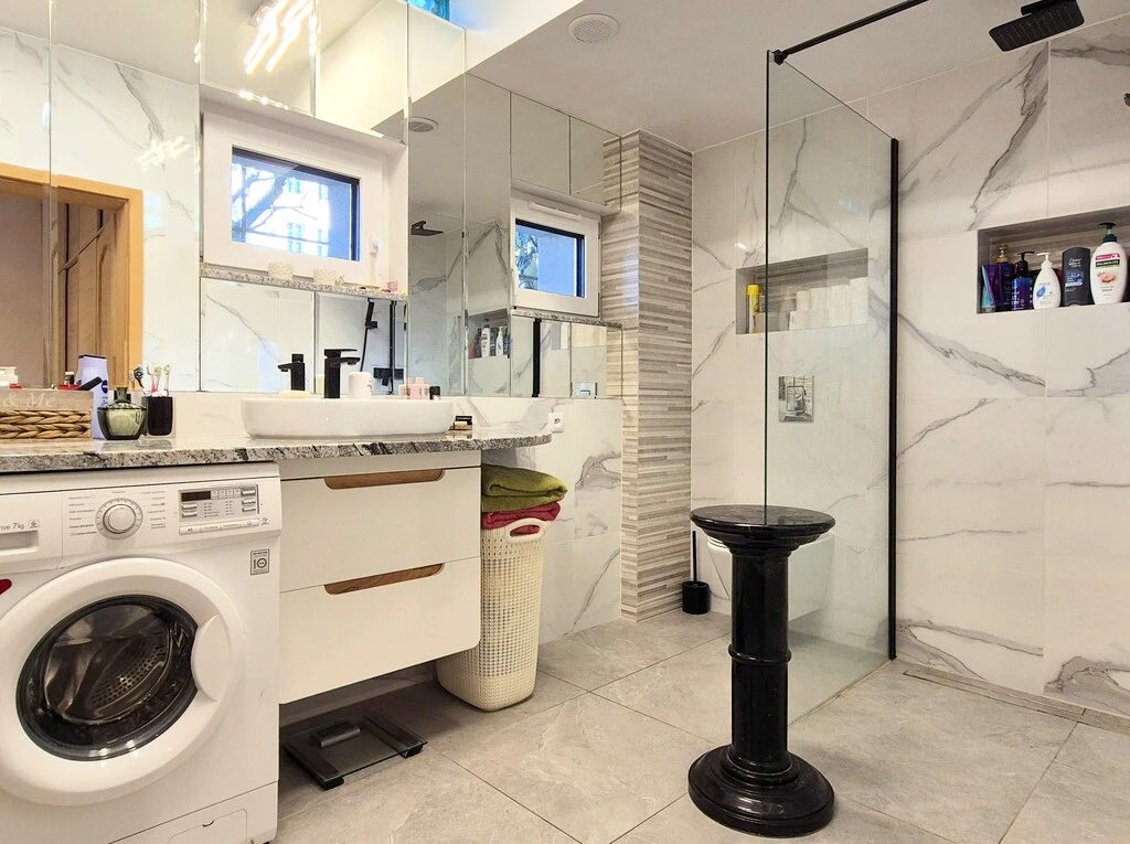 - Helles Badezimmer mit hochwertigen Materialien, Walk-in-Dusche, Waschmaschine, Grohe Unterputz-WC, moderner Heizkörper, mechanische Belüftung