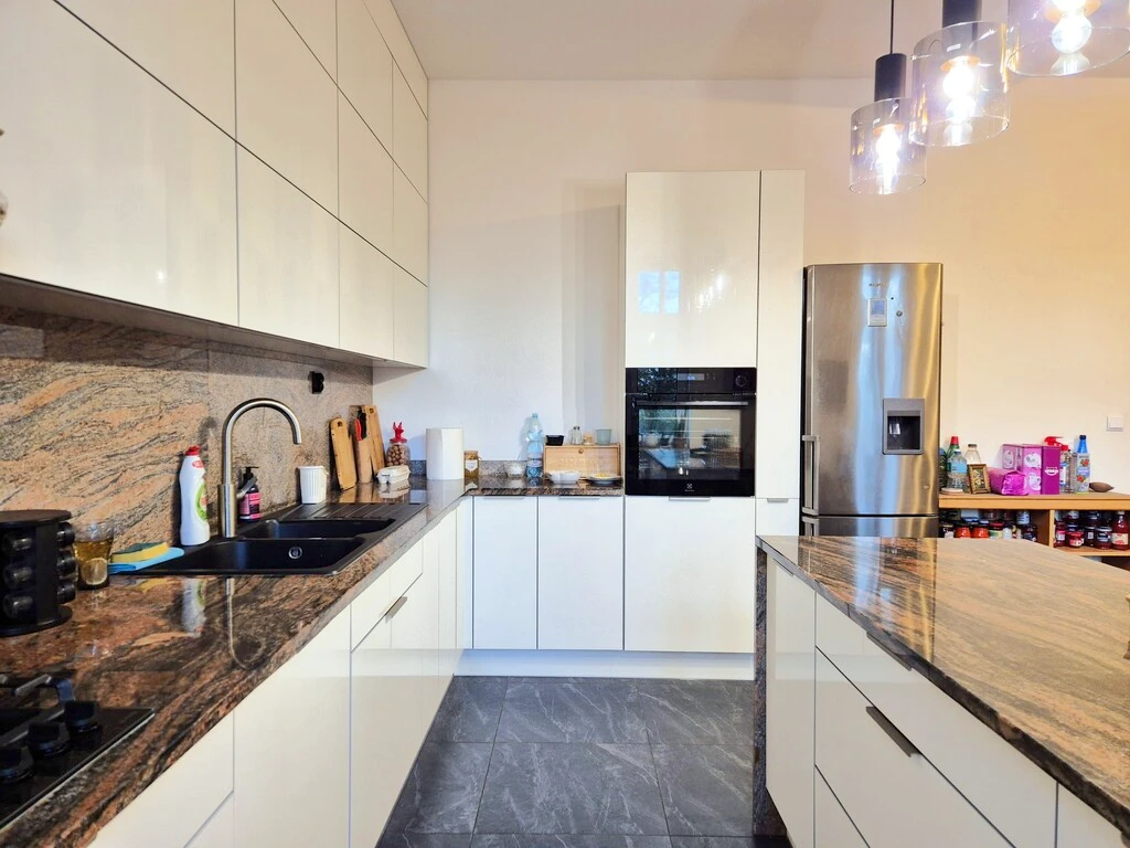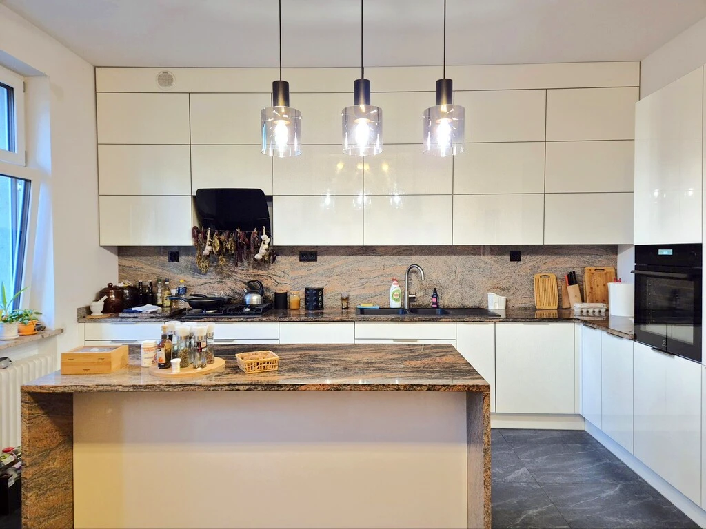 Moderne Küche mit maßgefertigten Einbaumöbeln in Weiß, Granitarbeitsplatten, Kücheninsel, und ausgestattet mit: Backofen, Kühl-Gefrierkombination, Gaskochfeld, Dunstabzugshaube, Geschirrspüler