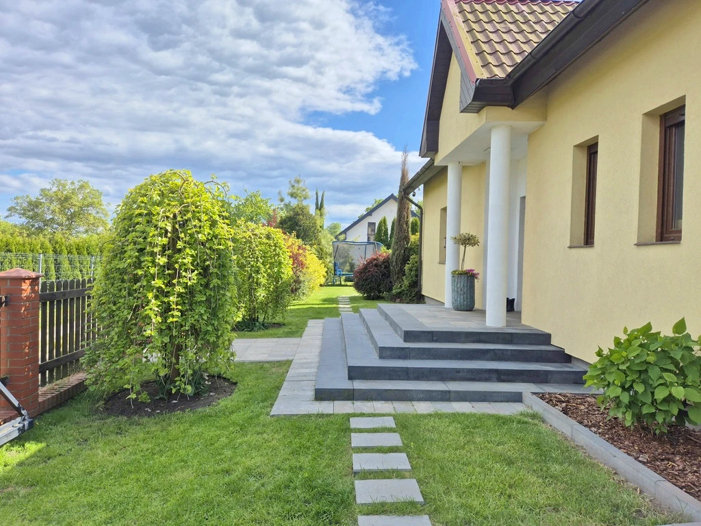 Willkommen in Ihrem neuen Zuhause! Inmitten einer ruhigen und gepflegten Wohngegend in Skolwin, Stettin, erwartet Sie dieses charmante, freistehende Einfamilienhaus mit großzügigem Garten – ideal für Familien oder alle, die Ruhe schätzen und dennoch nahe an der Stadt leben möchten.