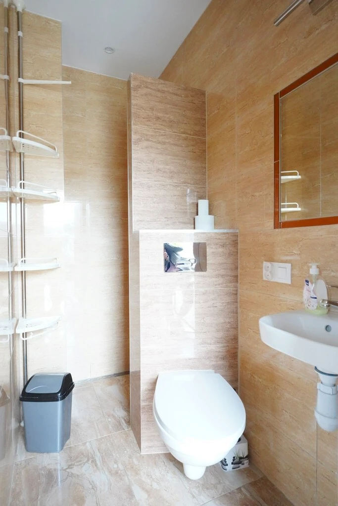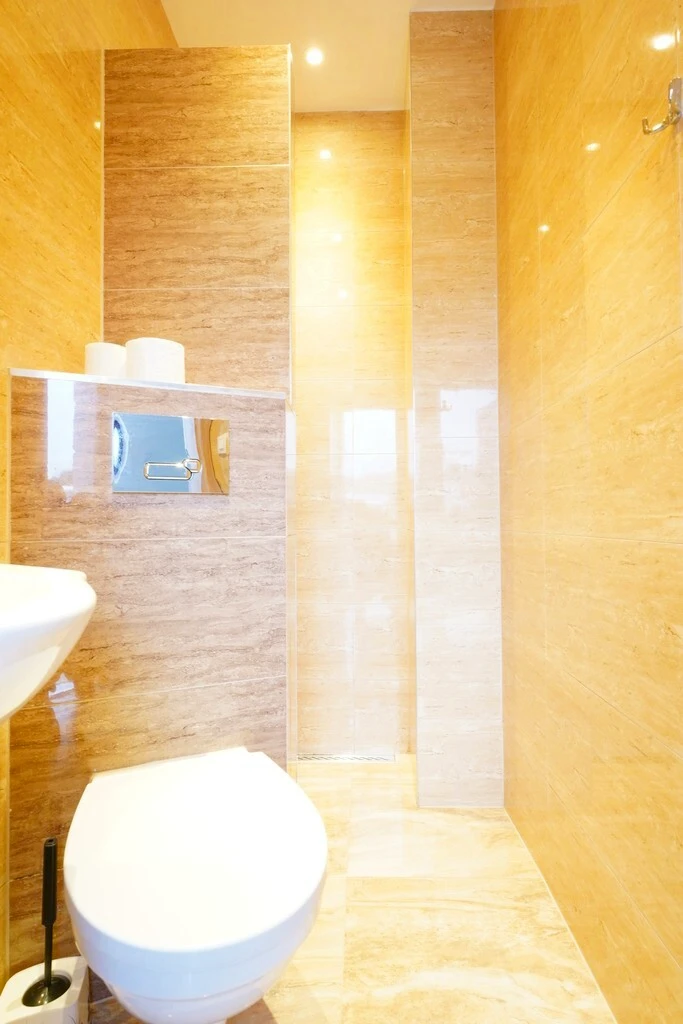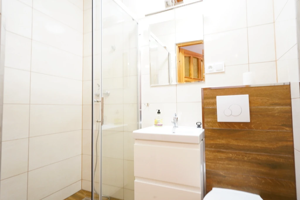 Badezimmerausstattung: Handtuchheizkörper, Dusche, WC
