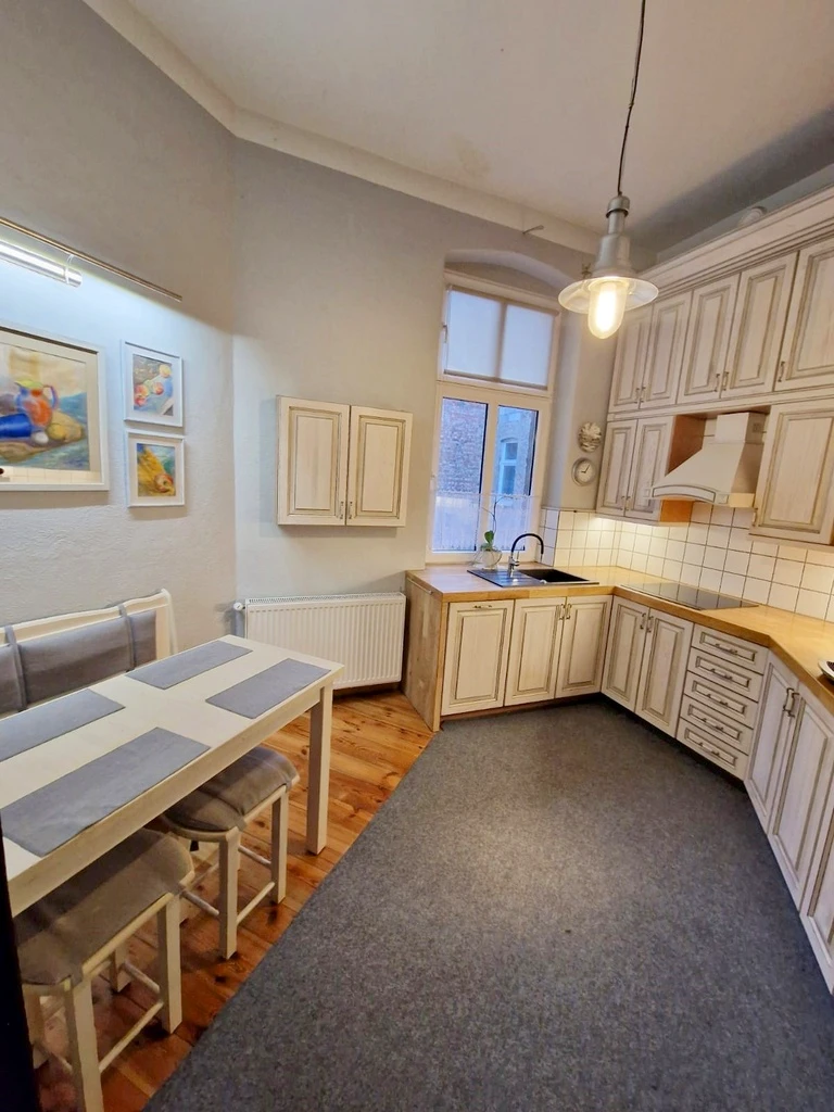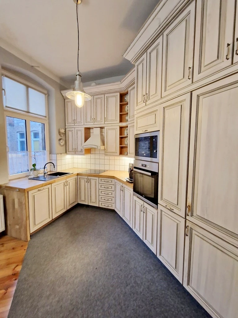 Die beeindruckende Raumhöhe von ca. 4 Metern schafft ein großzügiges, luftiges Wohnambiente. Die Küche besticht durch handgefertigte Holzmöbel und moderne Einbaugeräte, während die renovierten originalen Dielenböden den historischen Charakter der Wohnung unterstreichen.