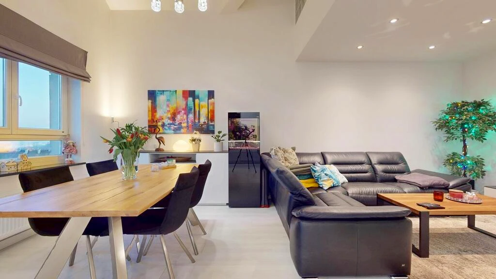 Die Kombination aus 5 Meter hohen Decken, stilvoller Beleuchtung und offener Galerie unterstreicht den loftartigen Stil der Wohnung und sorgt für ein einzigartiges Wohngefühl.