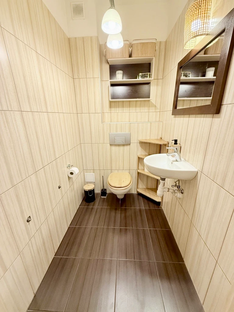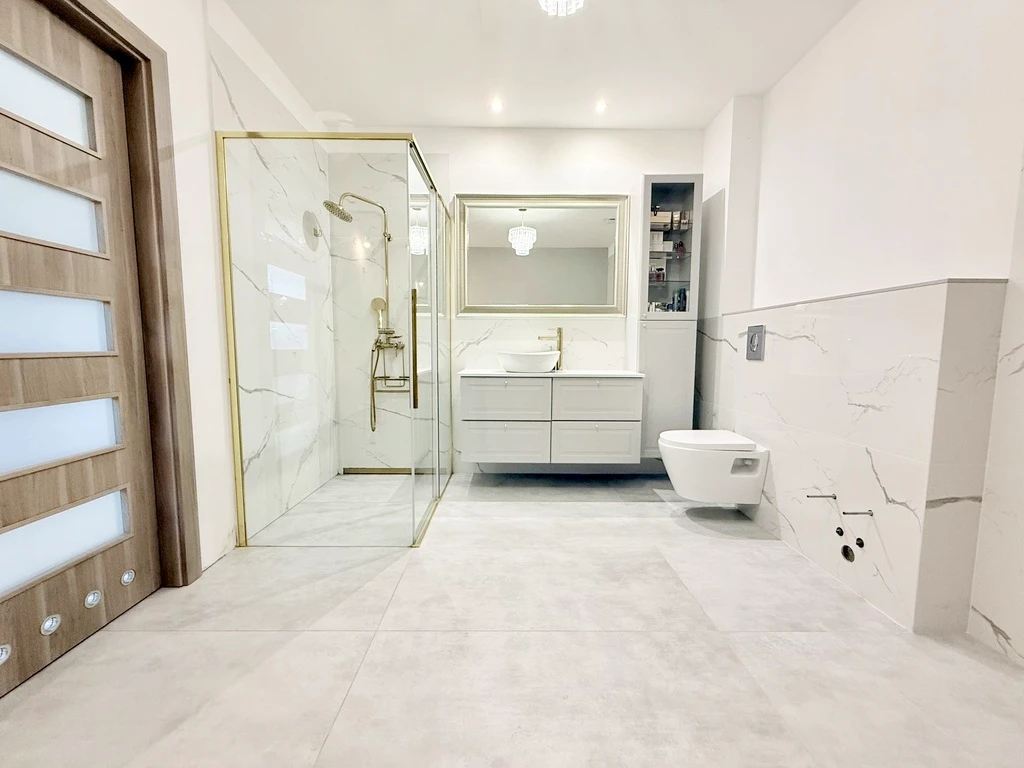 - Badezimmerausstattung: Handtuchheizkörper, Badewanne, Waschbecken, WC, Dusche