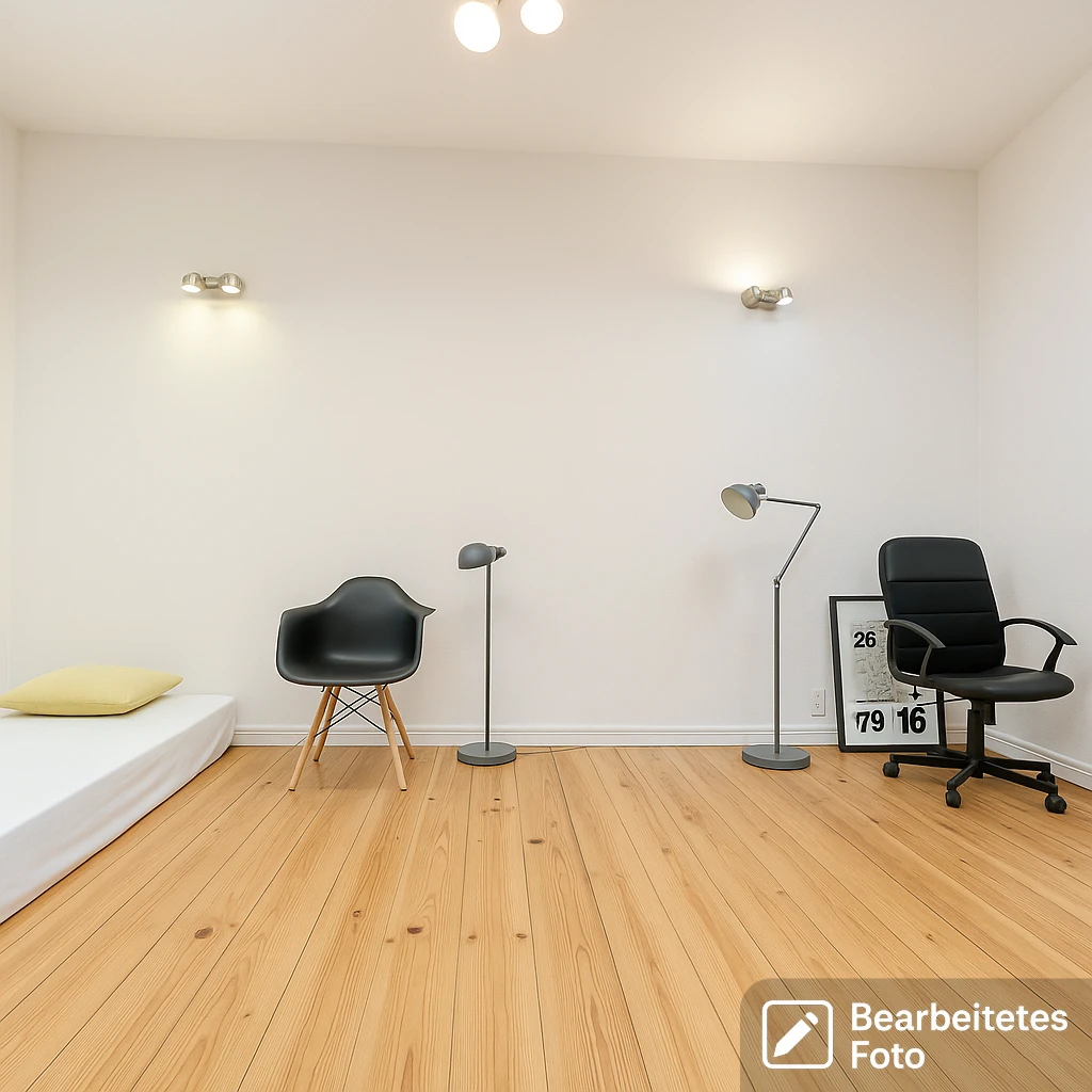 - Bodenbeläge: Holzdielen in den Wohnräumen, Fliesen in Küche und Bad