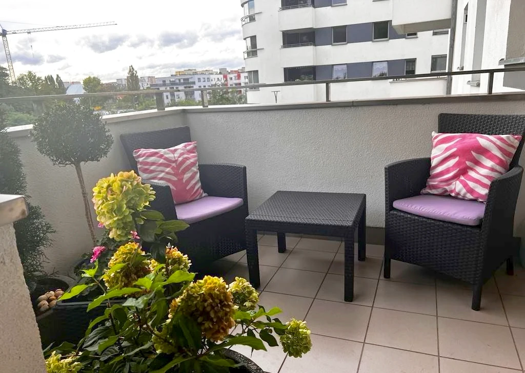 Der helle und einladende Wohnbereich bietet direkten Zugang zu einem großzügigen Balkon im Loggia-Stil – perfekt für entspannte Abende mit Blick ins Grüne. -