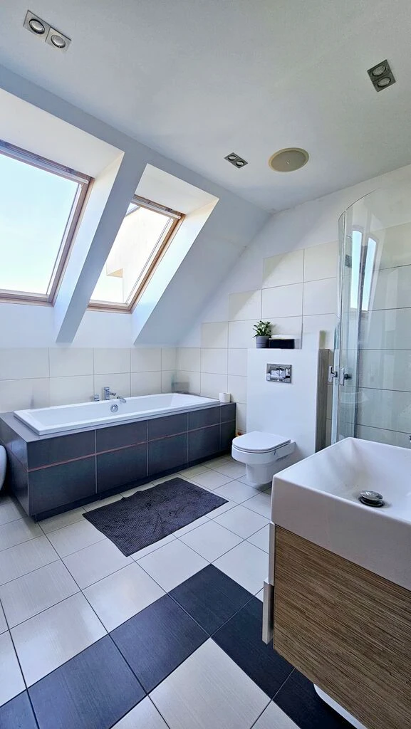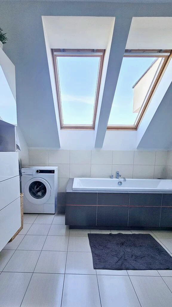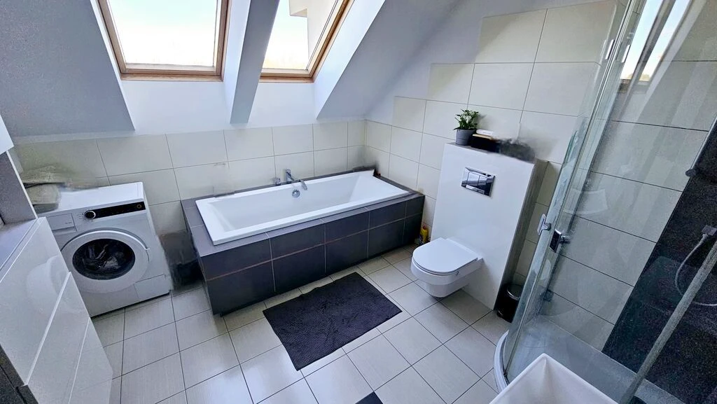 - Ausstattung: Waschbecken, WC, Handtuchheizkörper, Fenster, Waschmaschine, Badewanne, Dusche