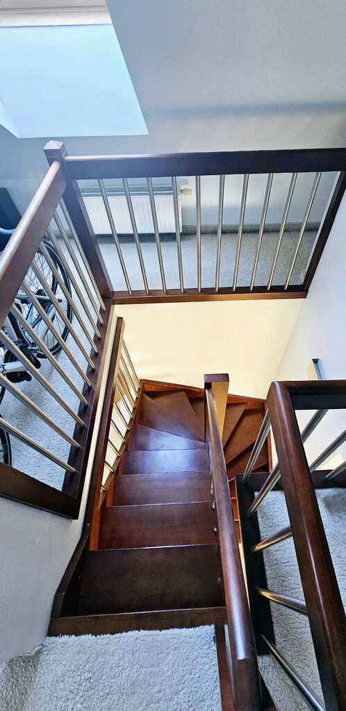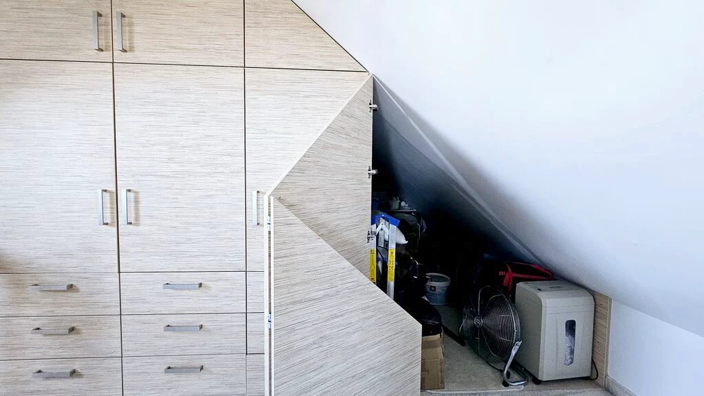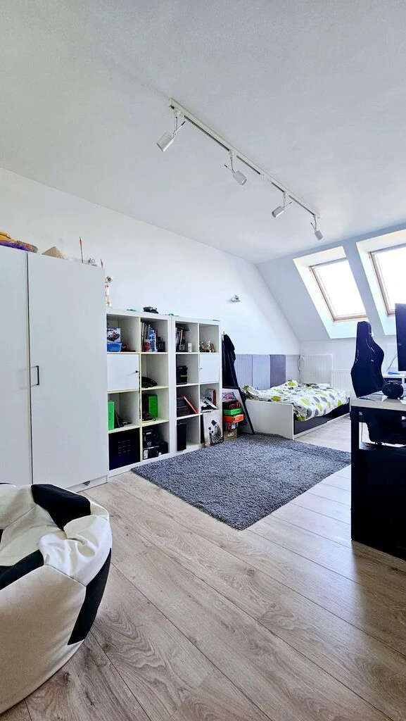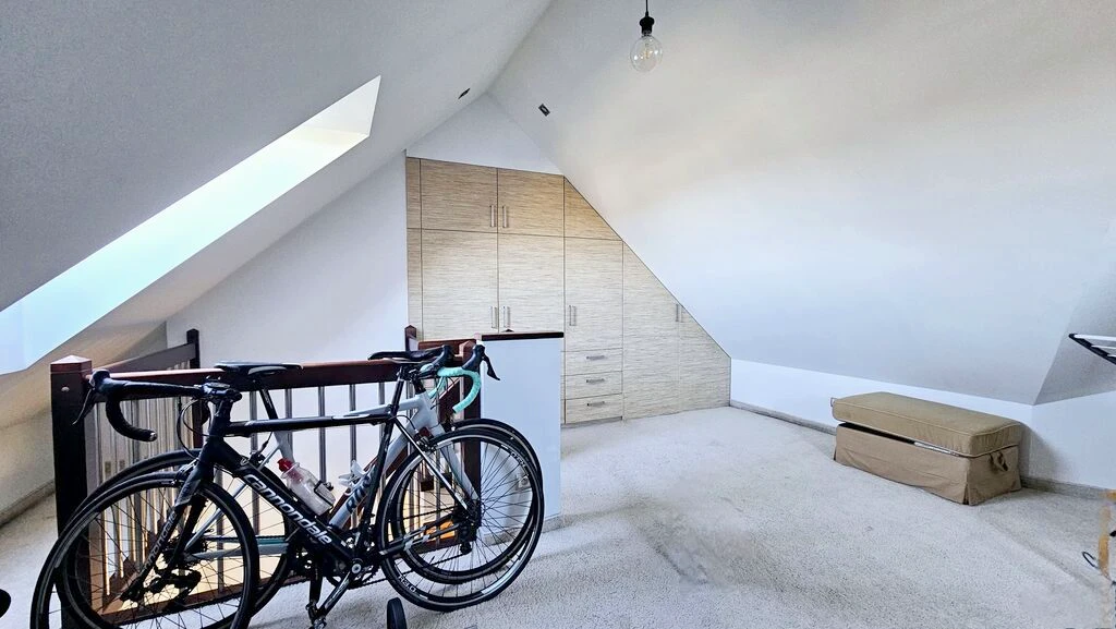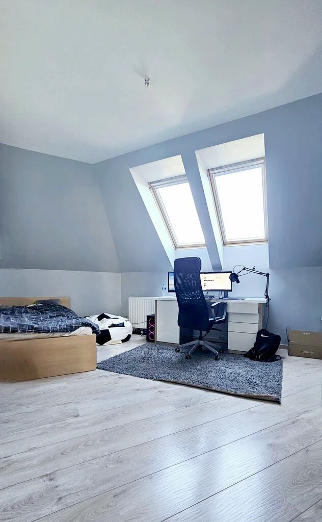 Zweite Ebene (ausgebautes Dachgeschoss, ca. 14,4 m² Nutzfläche): Über eine stilvolle Holztreppe gelangen Sie in das ausgebaute Dachgeschoss, das aktuell als zusätzliches Schlafzimmer genutzt wird. Die offene Raumgestaltung unter den Dachschrägen verleiht dem Raum eine gemütliche Atmosphäre. Ideal auch als Homeoffice oder Hobbyraum.