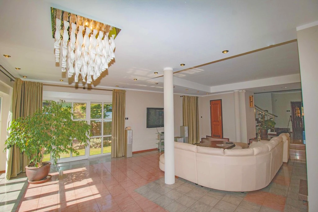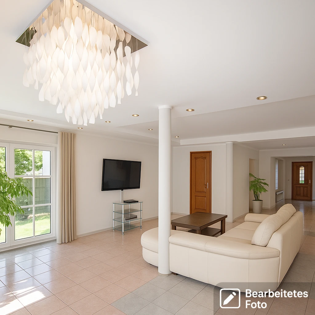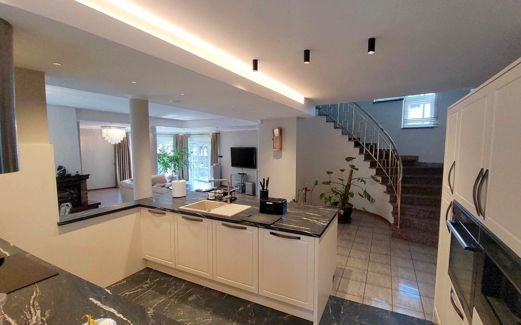Im gesamten Haus finden sich zahlreiche Lichtquellen, darunter einzigartige Kronleuchter aus geschliffenem Kristall. Die Böden sind mit hochwertigen Fliesen ausgestattet, die Wände fein gespachtelt und geschmackvoll gestrichen. Die breite Treppe mit Granitstufen und Messinggeländer führt elegant ins Obergeschoss. Der Wohnbereich sowie das Hauptschlafzimmer sind klimatisiert.