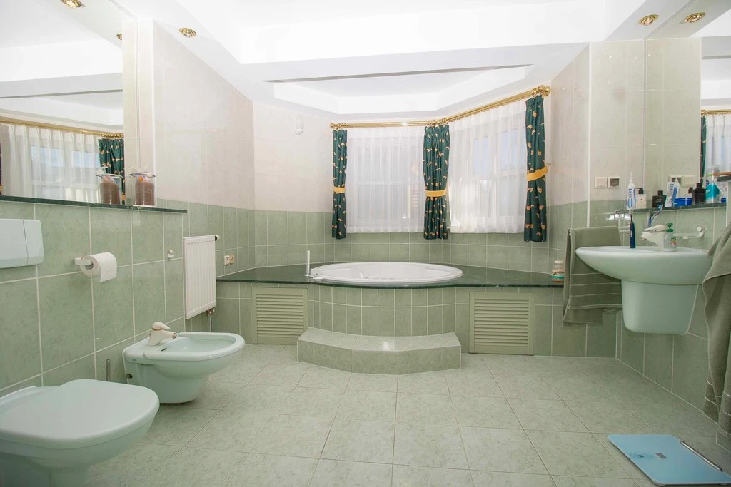 - Komfortables Badezimmer mit Whirlpool-Badewanne, zwei Waschbecken, Feinsteinzeug und Fliesen (10,54 m²)
