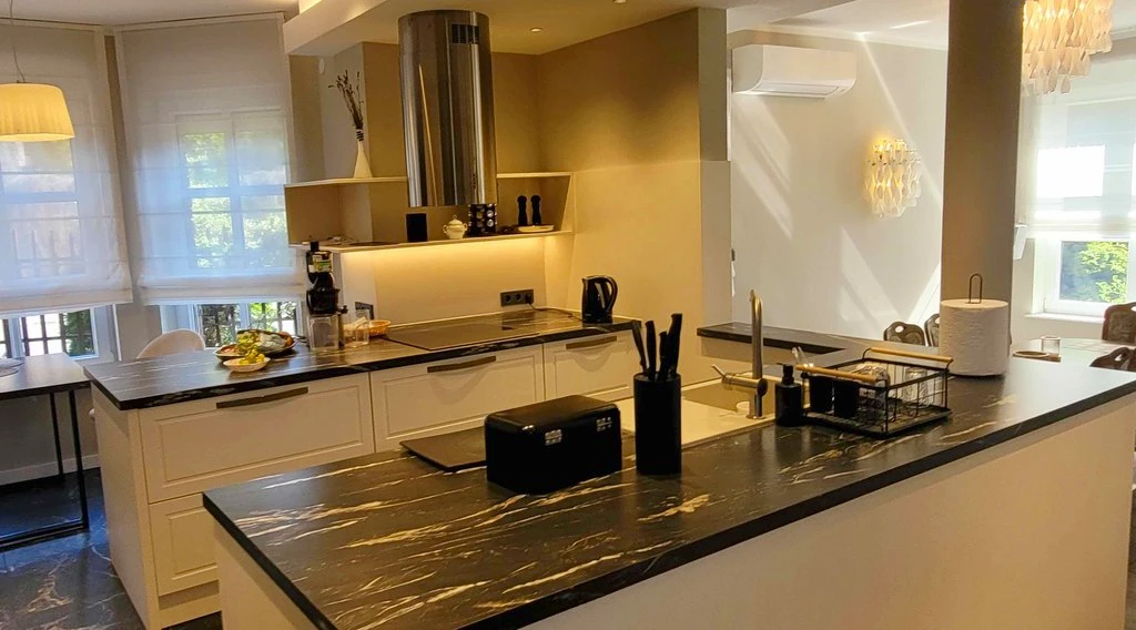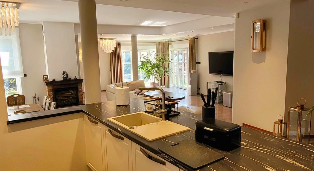 Das Haus wurde in enger Zusammenarbeit mit einem Architekten entworfen und mit hochwertigsten Materialien ausgestattet. Die stilvoll eingerichteten Innenräume überzeugen mit Liebe zum Detail – Beleuchtung, Badezimmerarmaturen und dekorative Elemente stammen aus Spanien, Italien und Deutschland. Seidene Vorhänge und das gesamte sichtbare Inventar (laut Fotos) können im Preis enthalten sein.