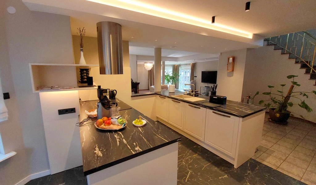 - Großzügiger offener Wohnbereich mit Kamin, Esszimmer und Küche (82,93 m²), Zugang zum Garten