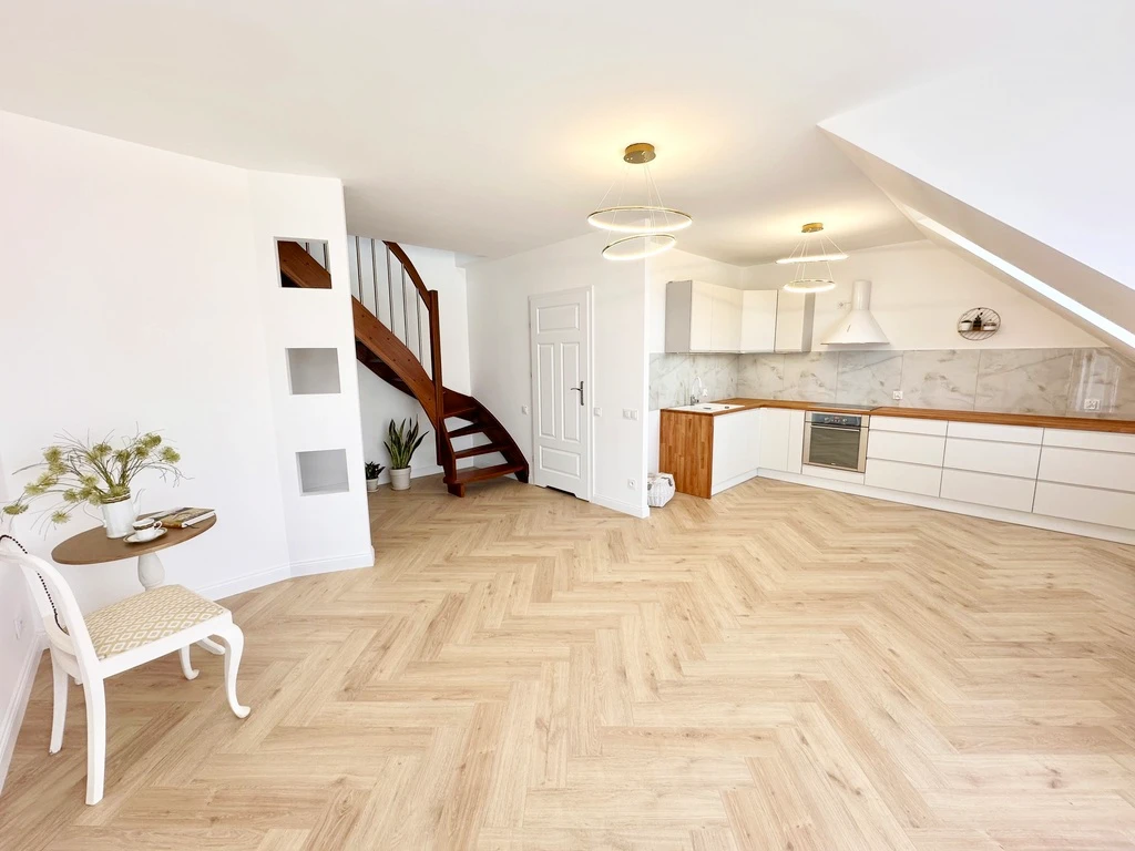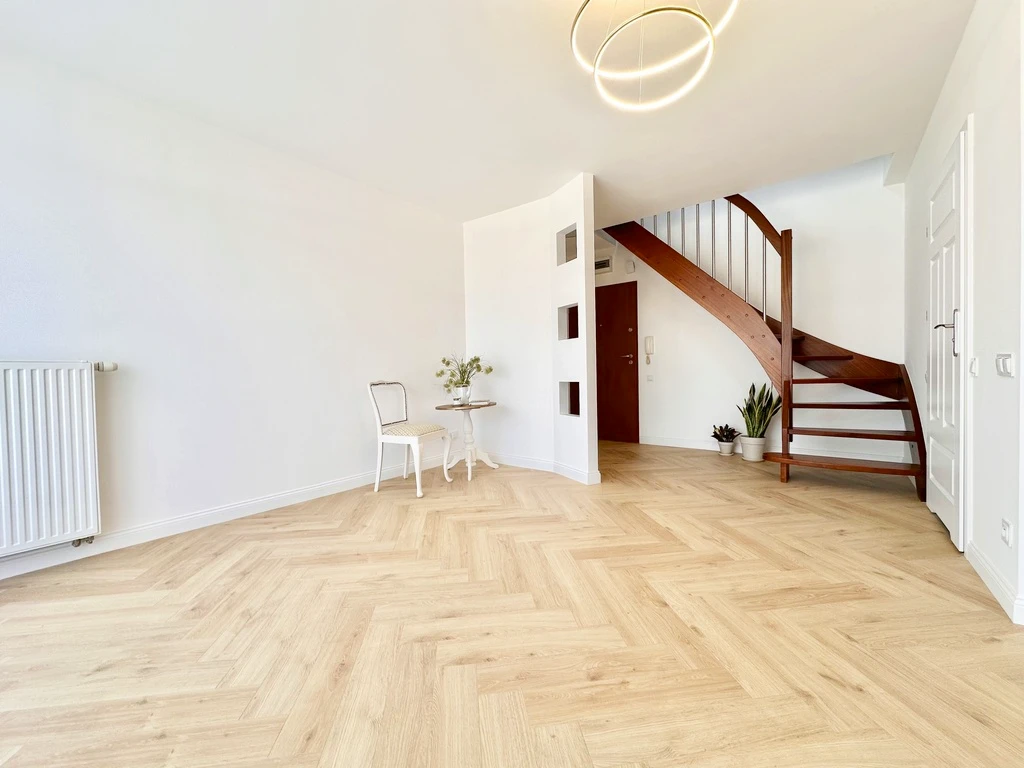 Zum Verkauf steht eine lichtdurchflutete 3-Zimmer-Maisonette-Wohnung mit einer Wohnfläche von 56 m² (ca. 80 m² tatsächliche Nutzfläche), gelegen in einer charmanten, ruhigen Wohnanlage – dem "Tęczowe Ogrody".