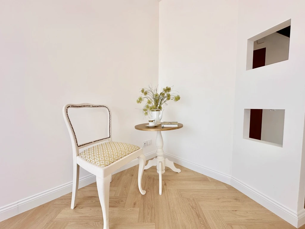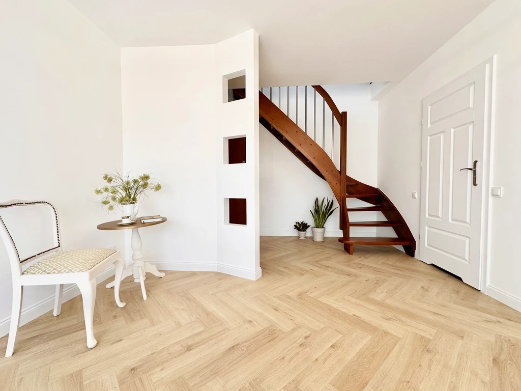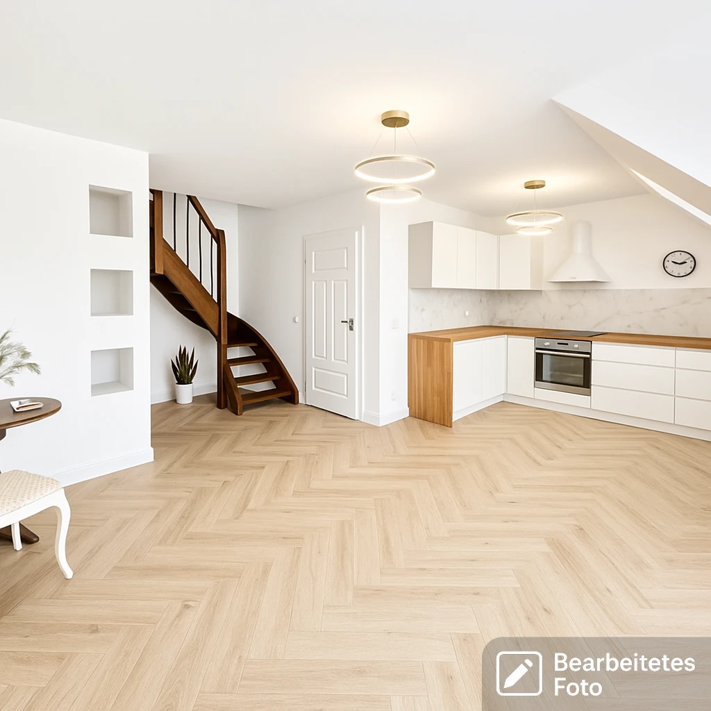 - Glatte, elegant gestrichene Wände und stilvoller Fischgrät-Parkettboden