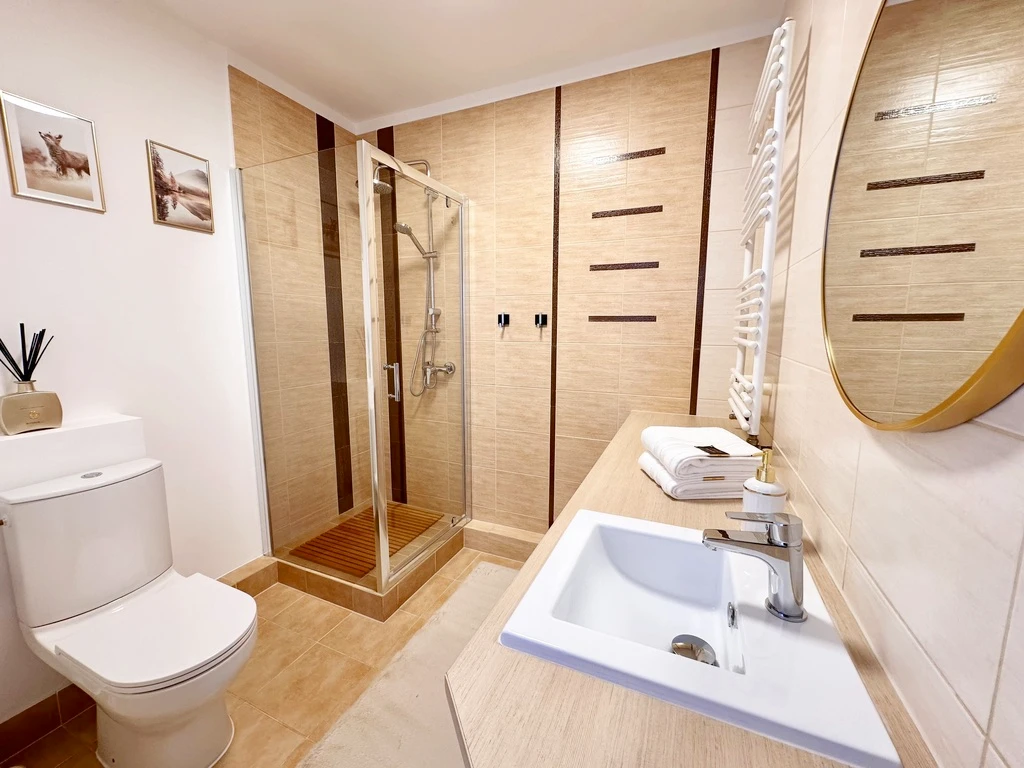 - Geräumiges Badezimmer mit moderner Duschkabine, stilvoller Waschtischplatte sowie Platz für Waschmaschine und Trockner