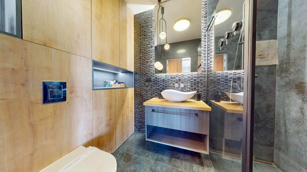 Das Badezimmer ist funktional und modern ausgestattet, während der Zugang zum Gebäude durch einen Aufzug erleichtert wird – ideal auch für ältere Personen oder Familien mit Kindern.