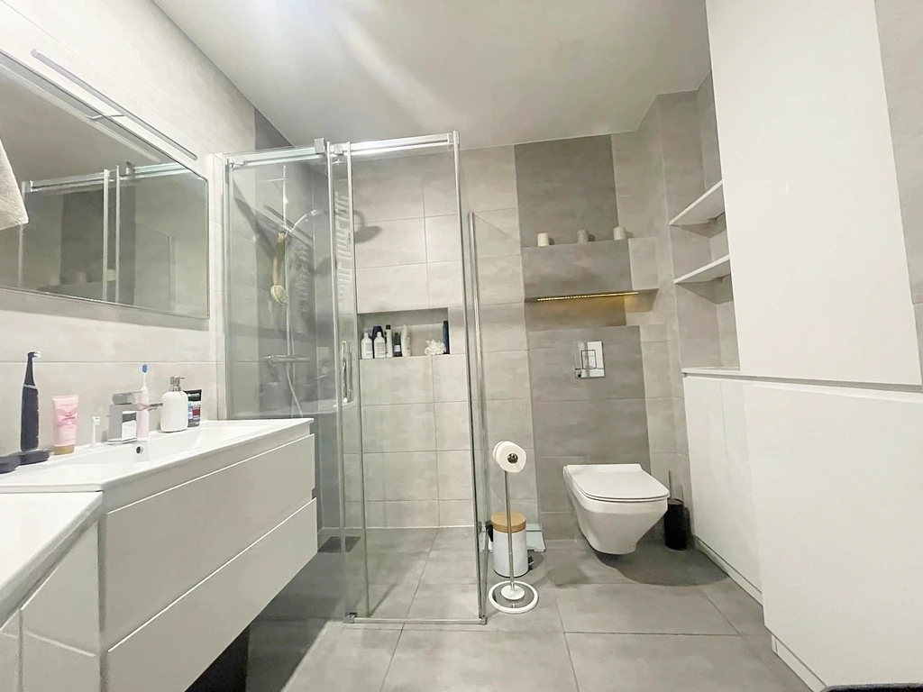 - Badezimmer – ausgestattet mit Dusche, Waschbecken, WC und Unterschrank