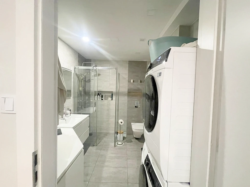 Badezimmerausstattung: Waschbecken, Waschmaschine, Dusche, WC