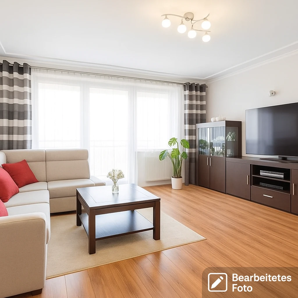 - ein geräumiges Wohnzimmer mit Zugang zum Balkon,
