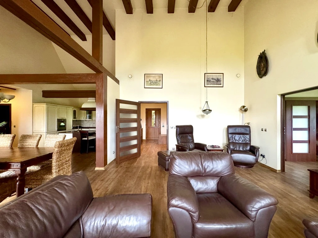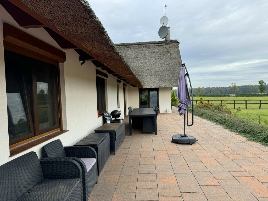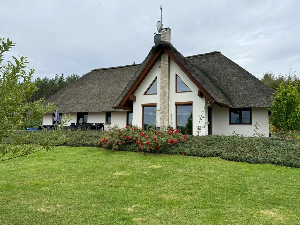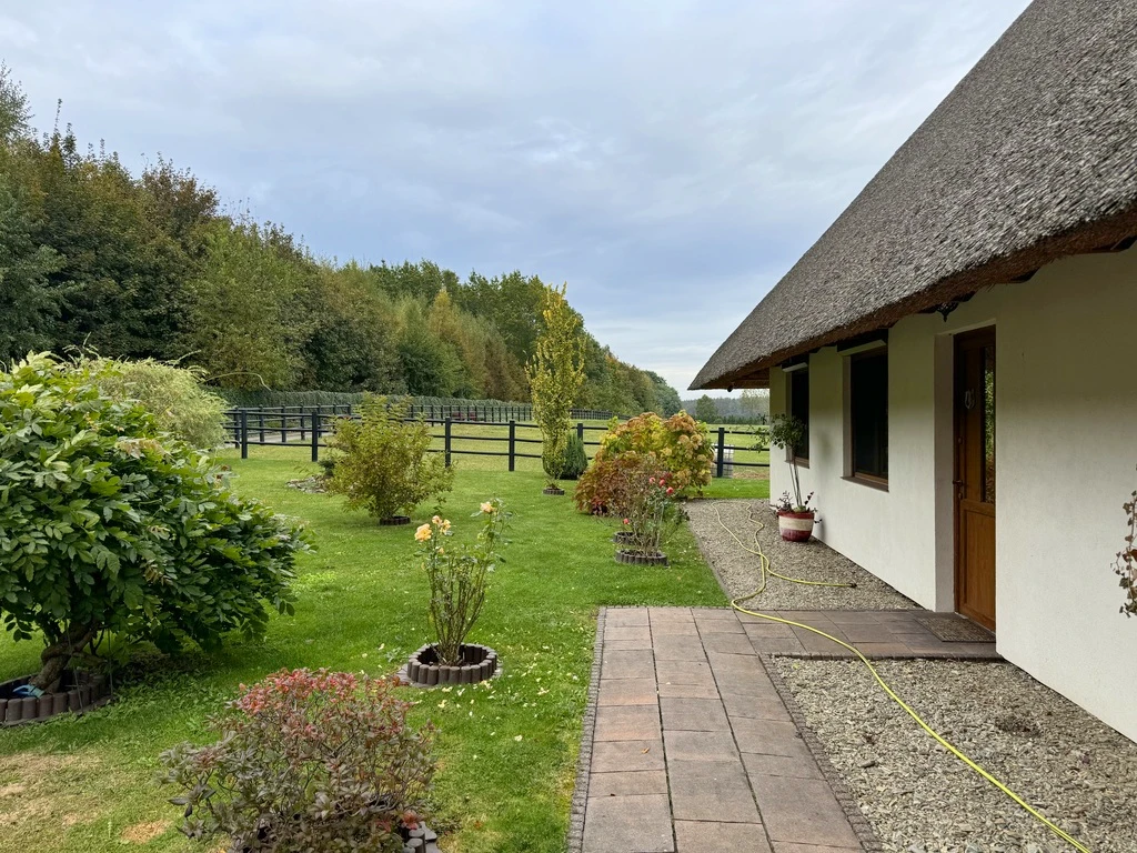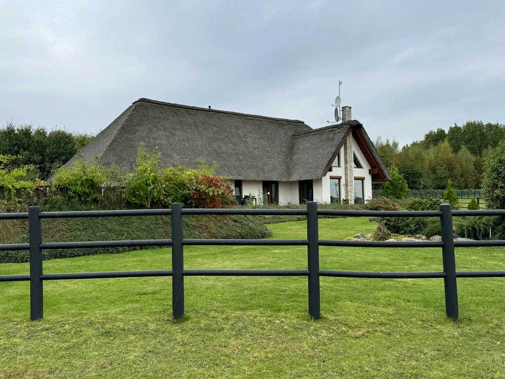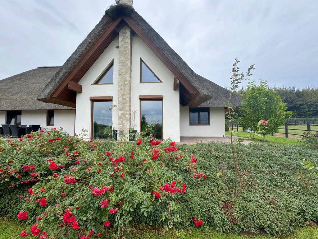 Das 2016 errichtete Wohnhaus mit einer Gesamtfläche von 203 m² überzeugt durch seine durchdachte Aufteilung, hochwertige Ausstattung und charmante Details wie ein Reetdach. Das Haus liegt leicht erhöht, mit Blick auf die grüne Landschaft und den angrenzenden Wald – eine ruhige, inspirierende Umgebung.