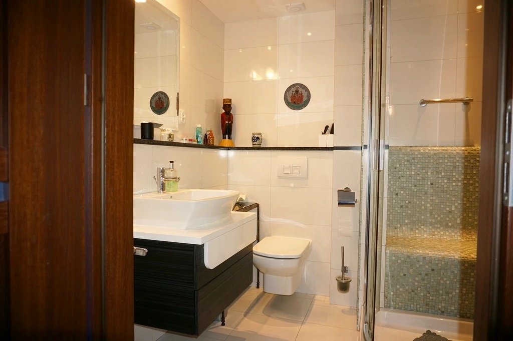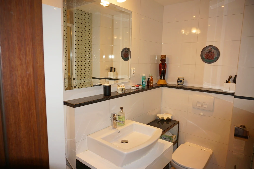 - Zweites Badezimmer mit Dusche (inkl. Sitzbank), ebenfalls modern gefliest