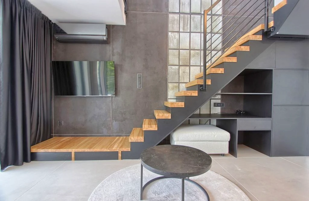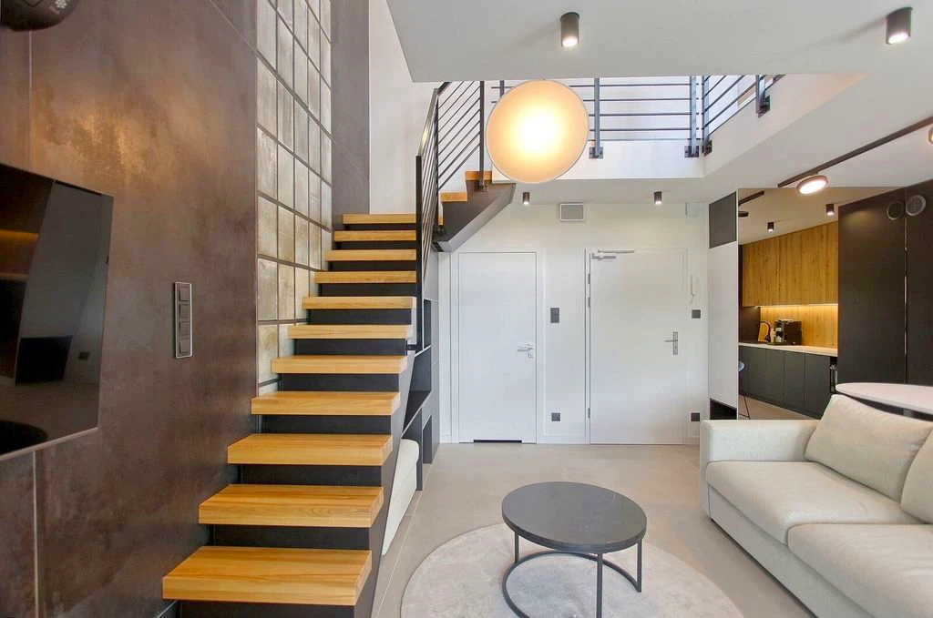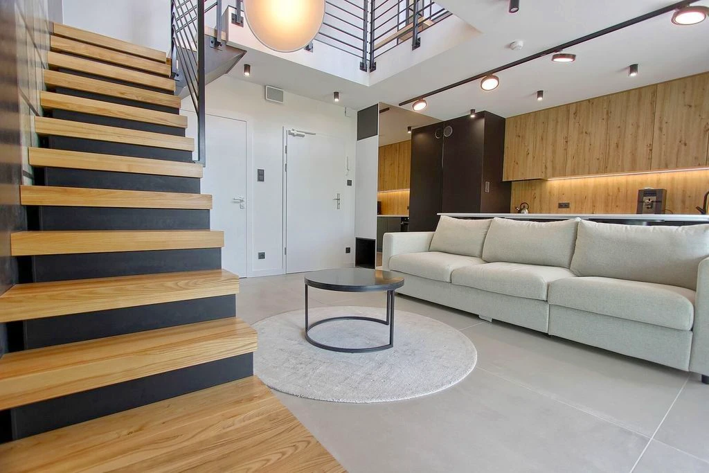 - Stilvolle Treppe mit Teppichauflage – verbindet harmonisch die Ebenen und unterstreicht das Designkonzept
