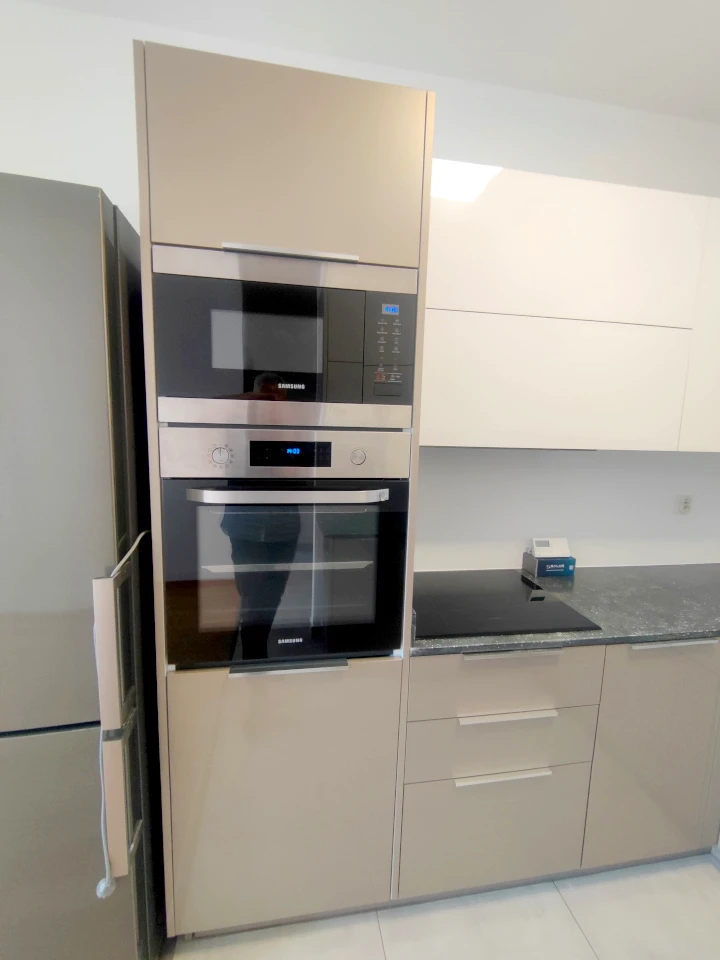 Die offene Küche ist mit maßgefertigten Einbaumöbeln und modernen, hochwertigen Elektrogeräten ausgestattet, die im Kaufpreis enthalten sind.