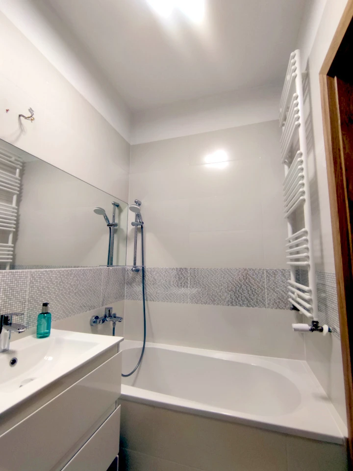Das moderne Badezimmer präsentiert sich in zeitloser Gestaltung mit hellen Fliesen und verfügt über eine komfortable Duschkabine.