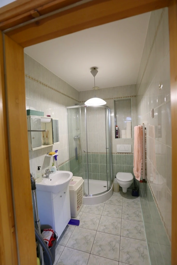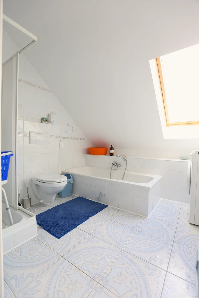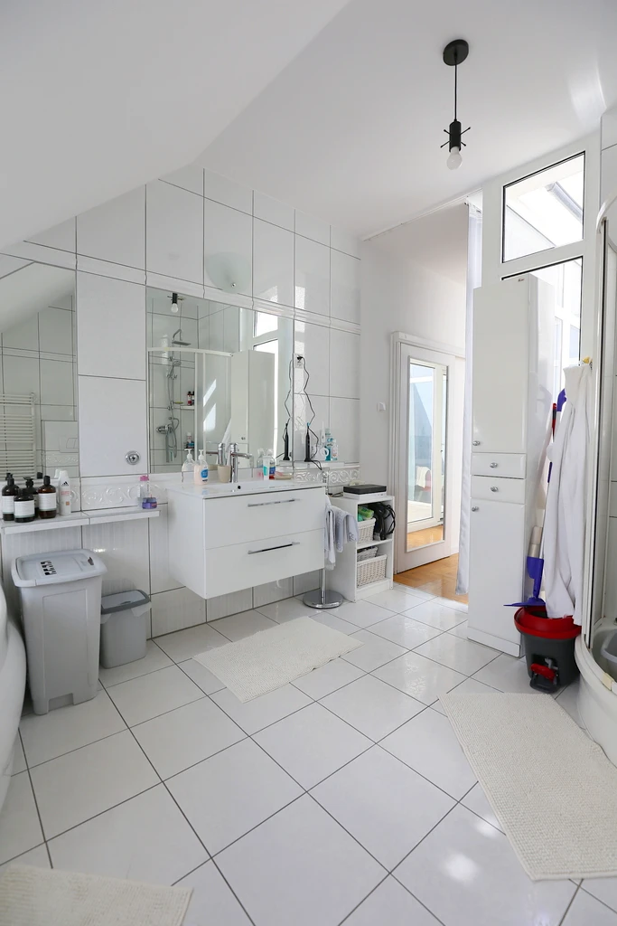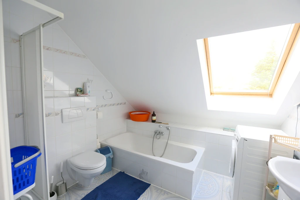 Badausstattung: Waschbecken, Fenster, Dusche, Handtuchheizkörper, Bidet, WC, Badewanne
