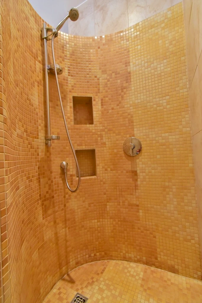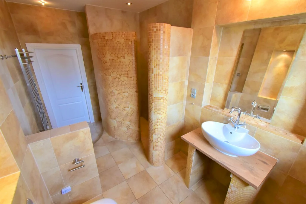 - Geräumiges Wellness-Badezimmer mit großer Duschkabine, Bidet und Waschmaschine