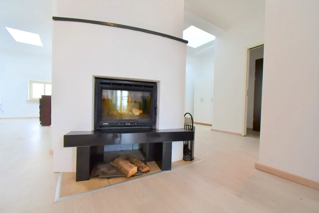 - Großzügiges Wohnzimmer mit modernem Design, Kamin und französischem Balkon – ideal zum Entspannen und Wohlfühlen