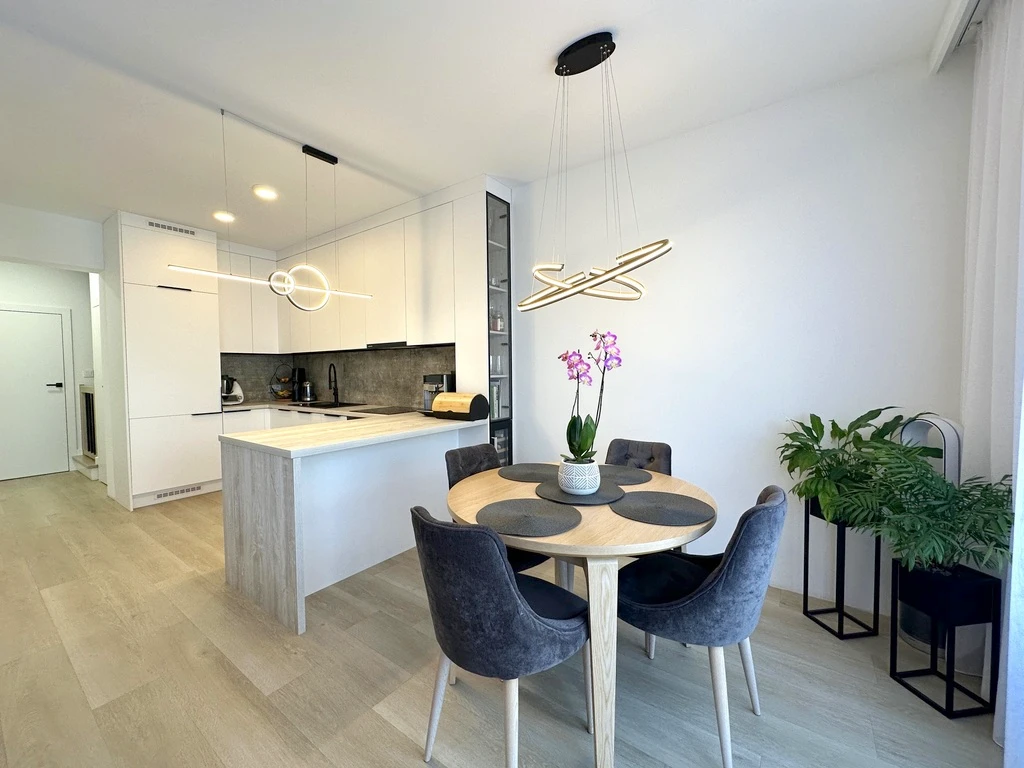 Das Haus wurde mit hochwertigen Materialien gebaut und mit viel Liebe zum Detail ausgestattet: robuste Vinylböden, individuell angefertigte Tischlermöbel, elektrische Garage mit Fernsteuerung sowie Technikvorbereitung für einen Kamin und elektrische Außenrollläden.