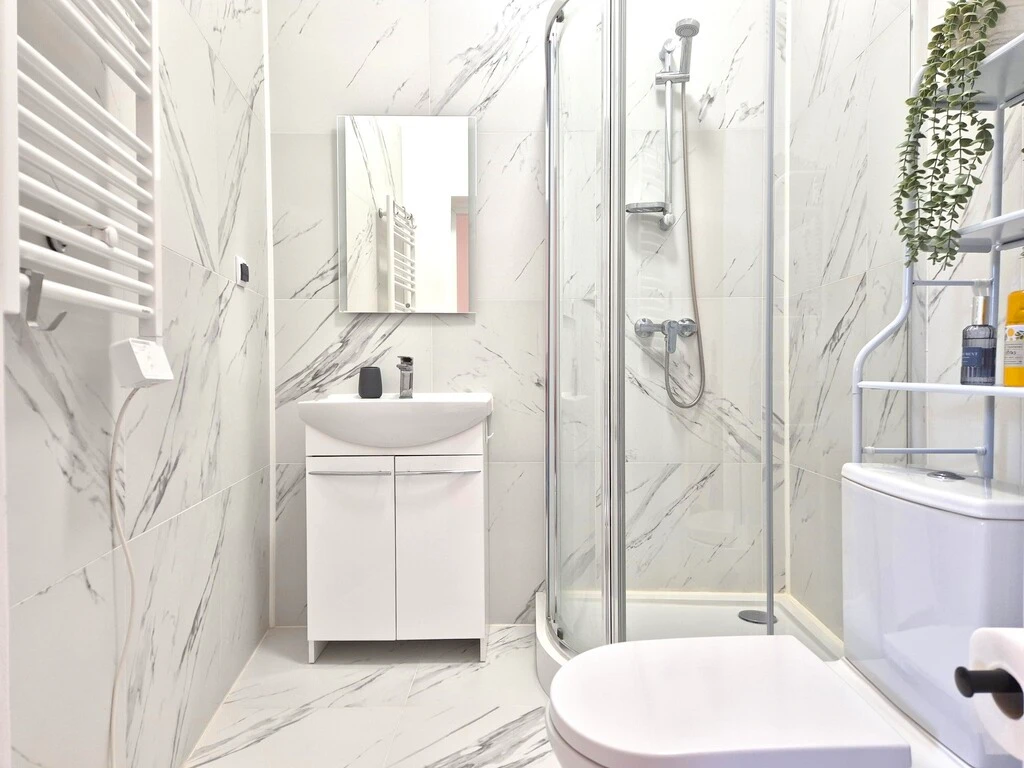 - Badezimmer mit Dusche, WC und Waschbecken.