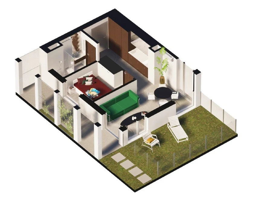 Die Erdgeschosswohnungen verfügen über private Gärten im Preis inbegriffen, mit Flächen zwischen 18 m² und 25 m².