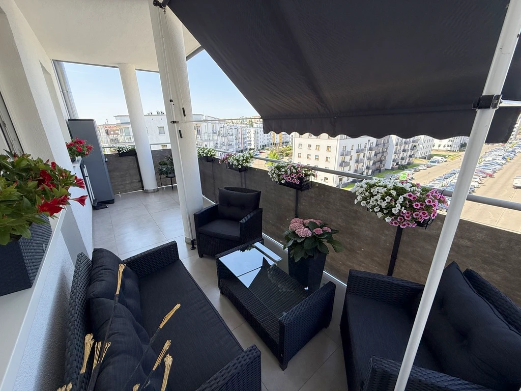 Der überdachte Balkon mit elektrischer Markise eignet sich ideal als sommerlicher Rückzugsort und bietet zusätzlichen Wohnraum im Freien. -