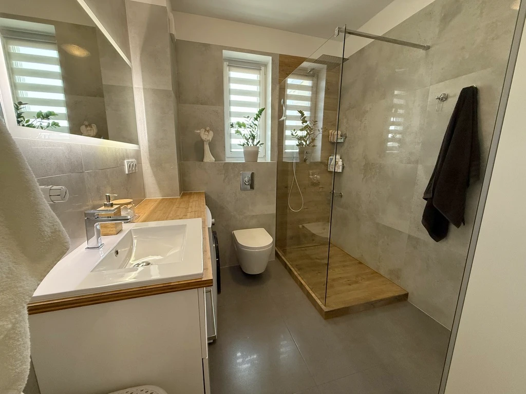 - Badezimmerausstattung: Dusche, Waschbecken, Waschmaschine