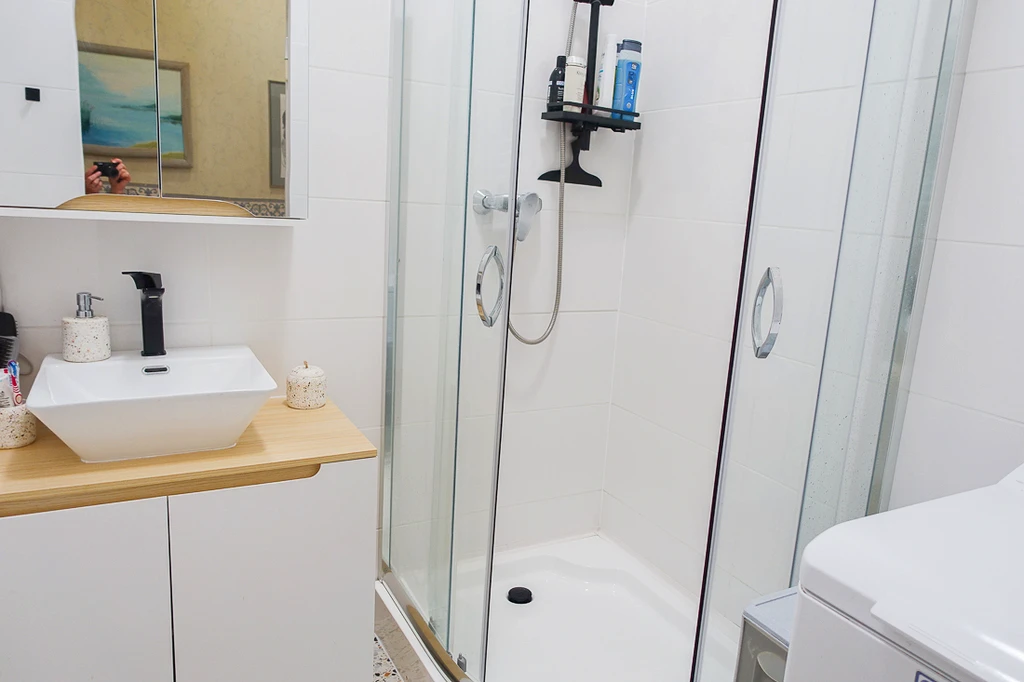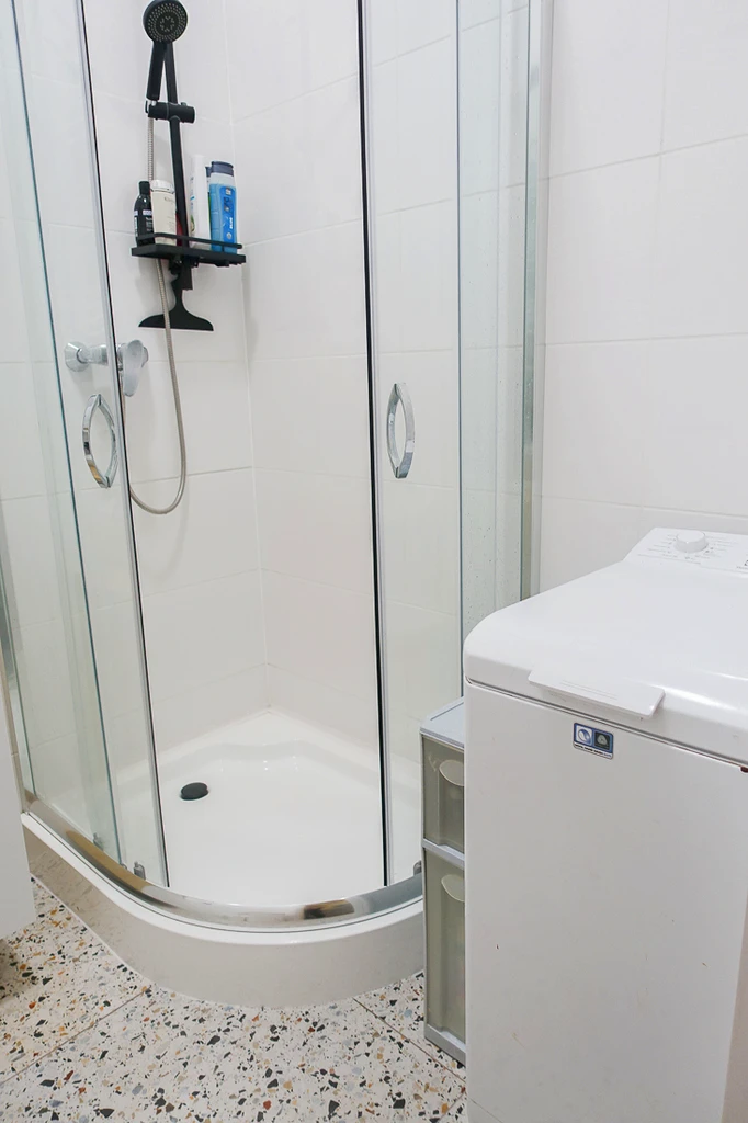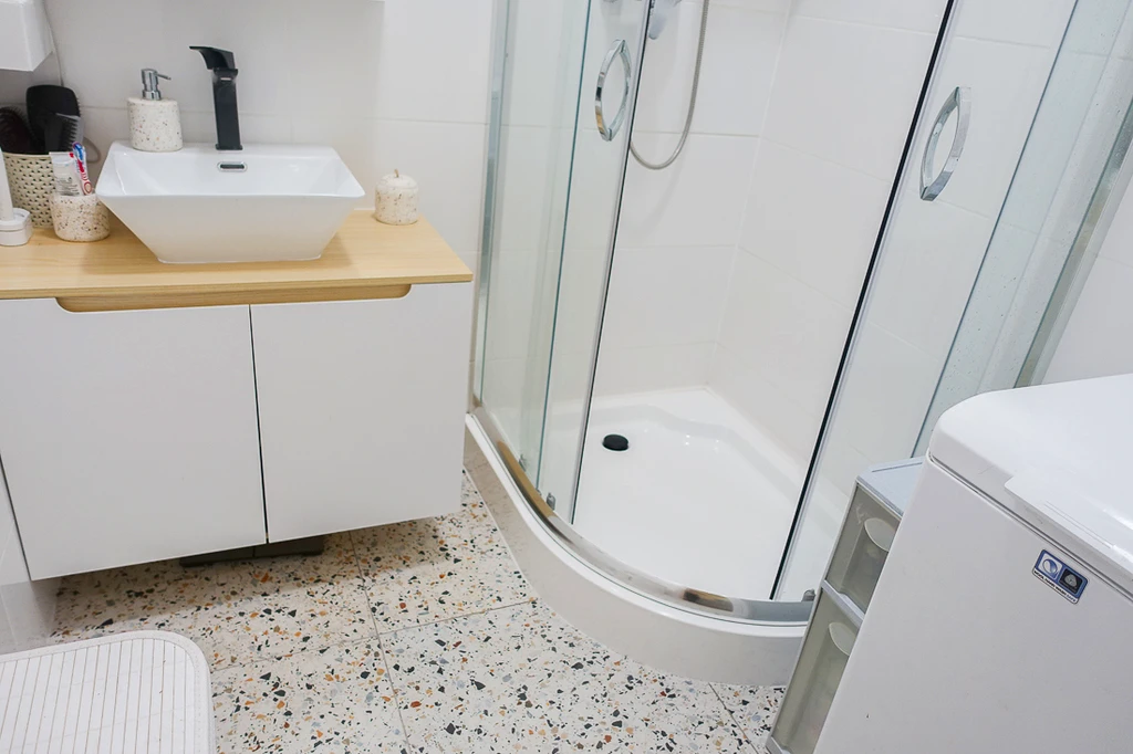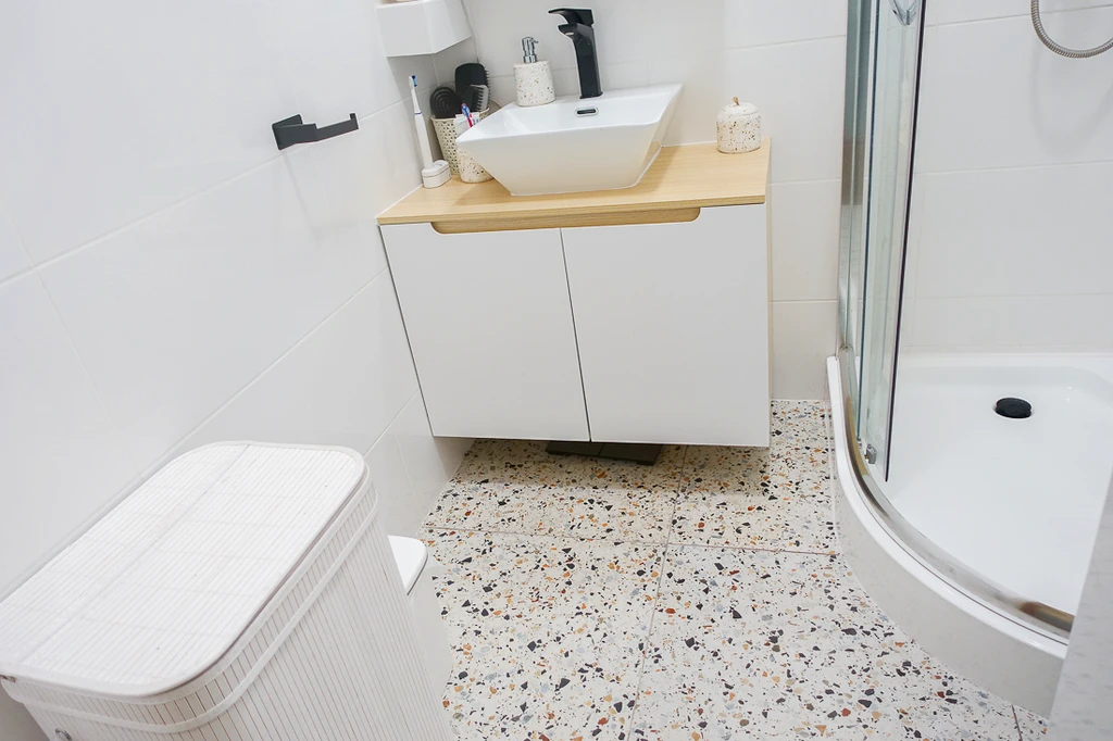 - Bad: frisch renoviert, ca. 3 m² mit neuer Duschkabine, stylischen Fliesen, Waschbecken mit Unterschrank und Anschluss für die Waschmaschine
