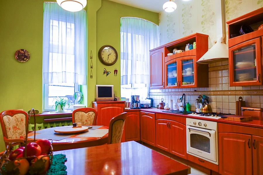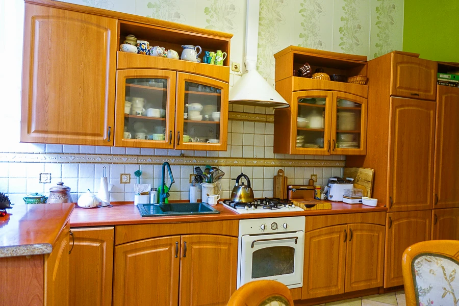 - Küche: separate, fast quadratische Küche (14 m²), ausgestattet mit modernen Einbauküchenmöbeln und hochwertigen Elektrogeräten (Kühlschrank, Geschirrspüler, Cerankochfeld, Backofen, Dunstabzugshaube)