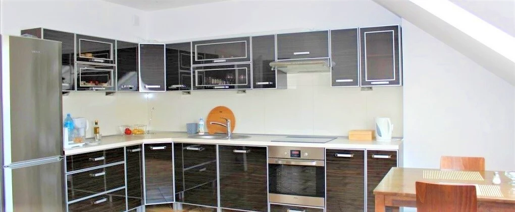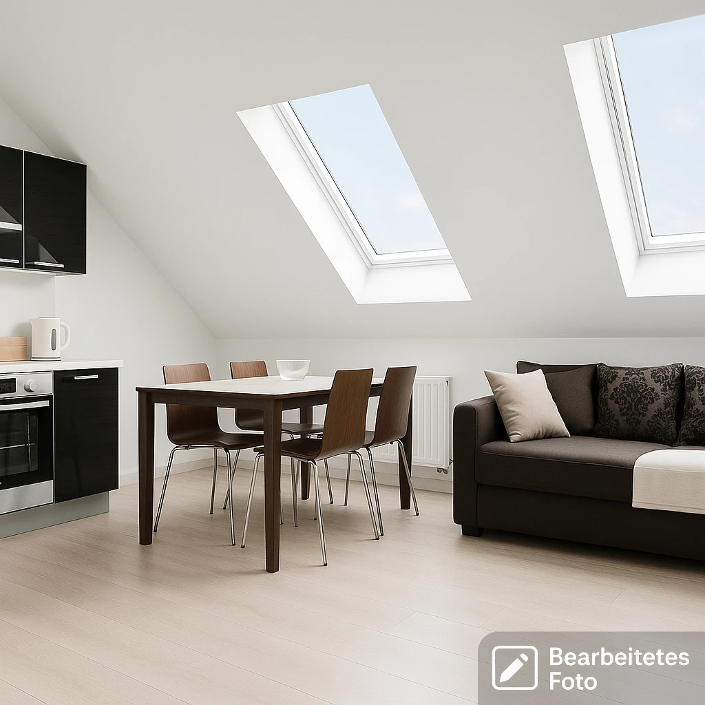 Die moderne Wohnung überzeugt durch einen offenen Wohn- und Essbereich mit integrierter Küche, drei gemütliche Schlafzimmer sowie ein helles Badezimmer und ein separates WC. Leichte Dachschrägen verleihen den Räumlichkeiten eine besondere Atmosphäre und tragen zum charmanten Charakter der Wohnung bei.