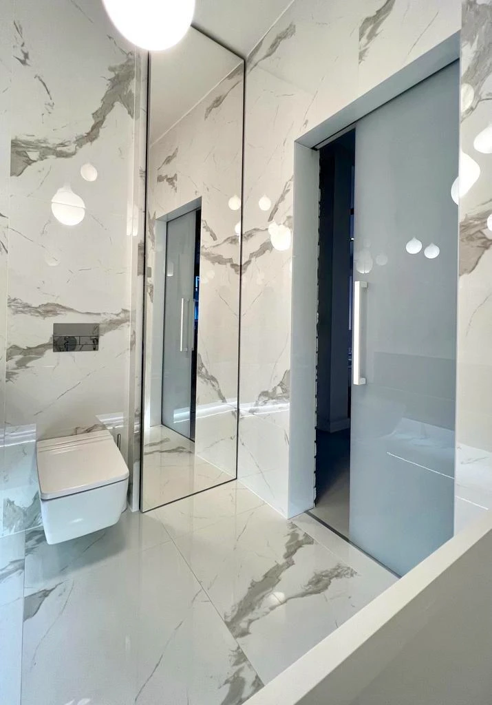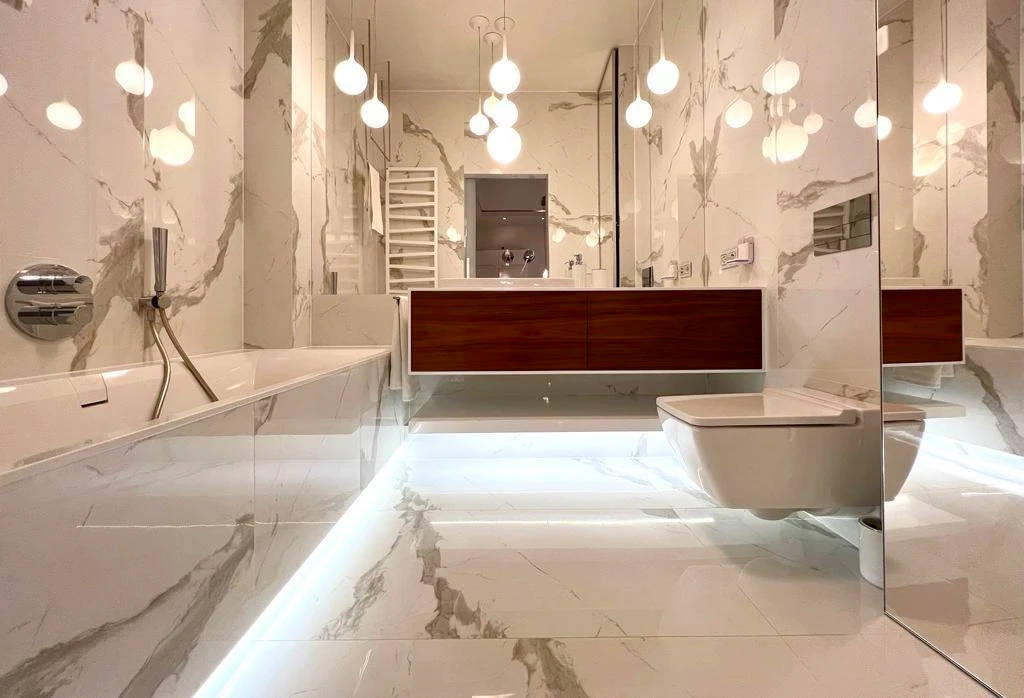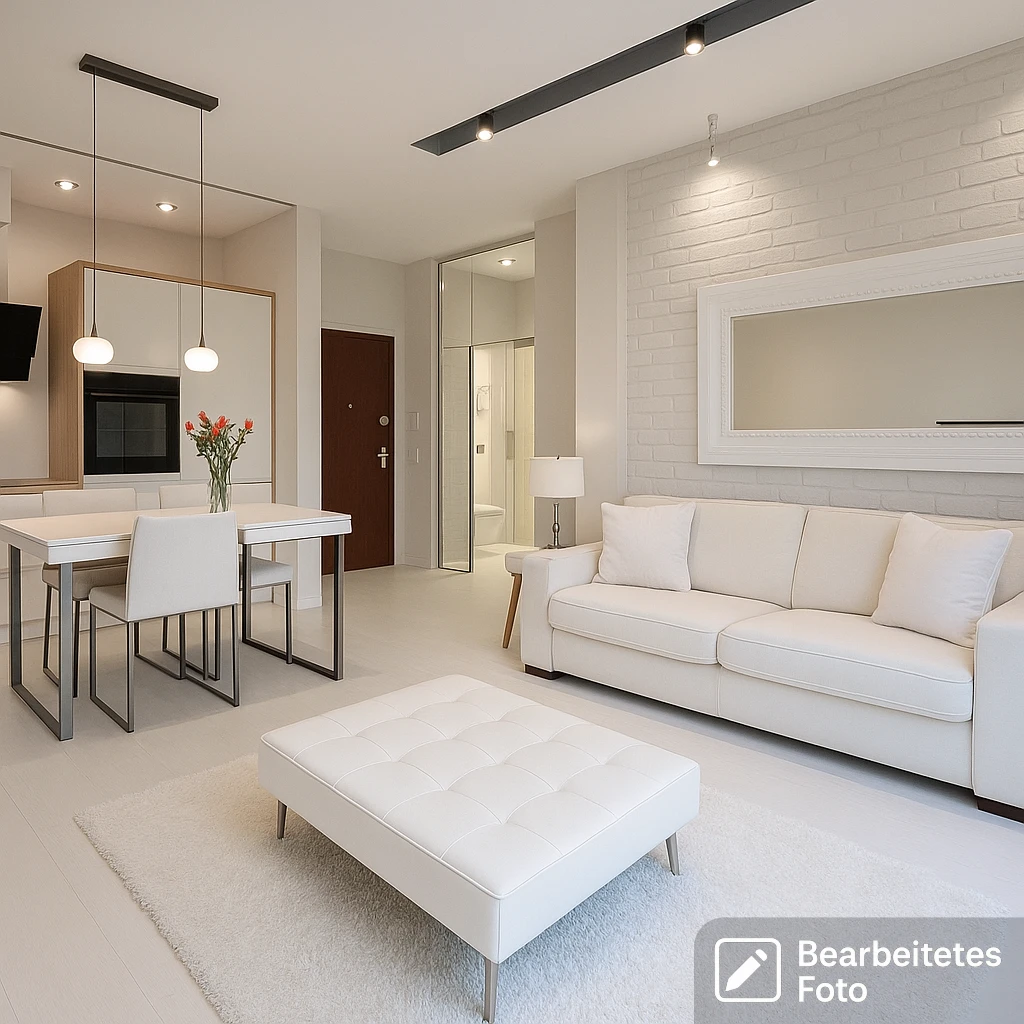 - Hochwertige Materialien: Natursteinwände, elegante Fliesen in Cremefarbe, Teppichboden im Schlafzimmer