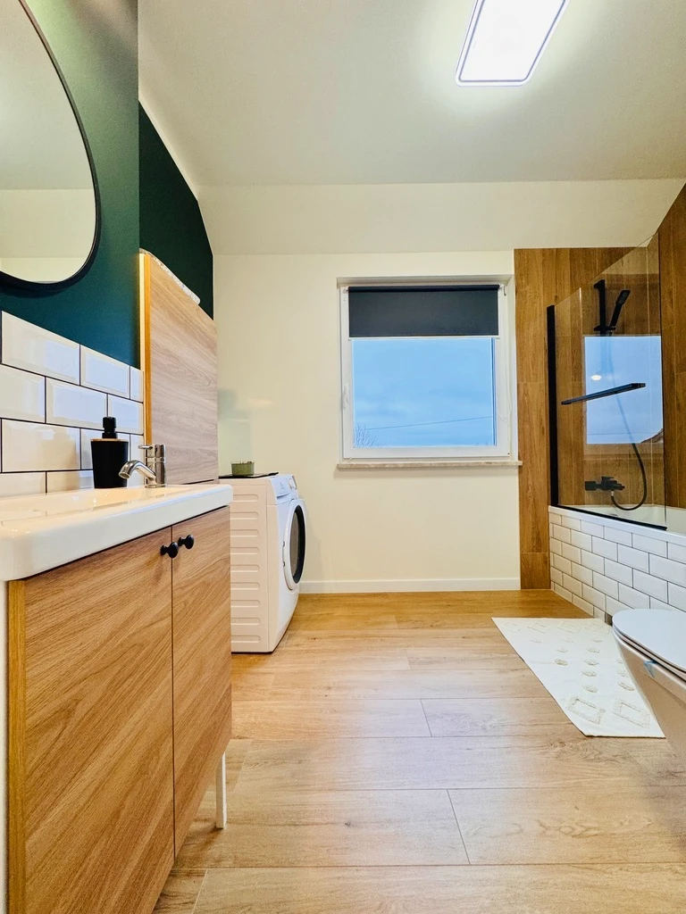 Badezimmerausstattung: WC, Waschmaschine, Badewanne, Waschbecken, Fenster, Handtuchheizkörper