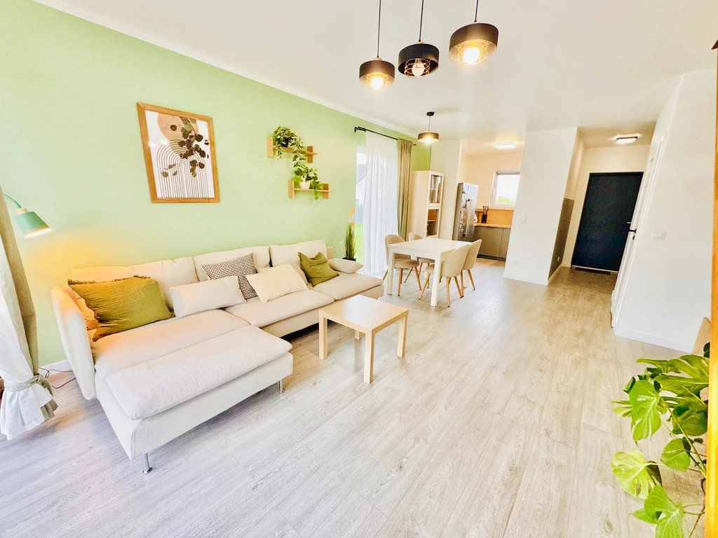 Die Wohnfläche von ca. 112 m² verteilt sich auf zwei Etagen und bietet durchdachte Raumaufteilung, hochwertige Ausstattung sowie modernes, energieeffizientes Wohnen durch Luftwärmepumpe und Fußbodenheizung im gesamten Haus.