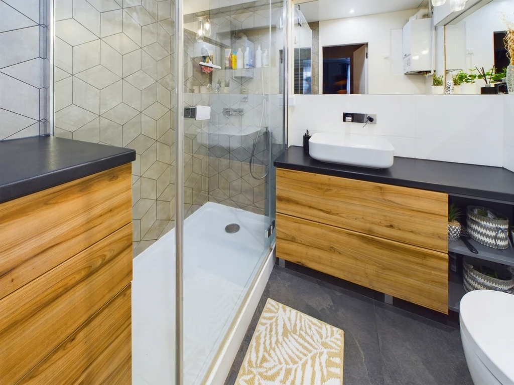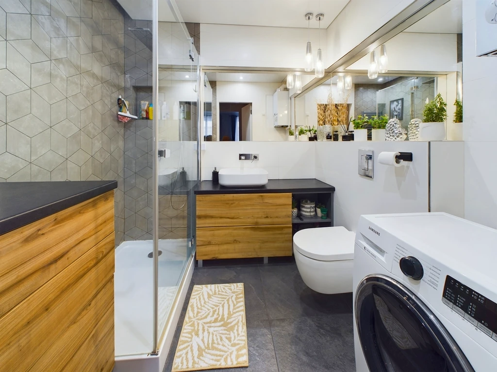 - Modernes Badezimmer mit Dusche, Waschbecken, WC und Waschmaschine