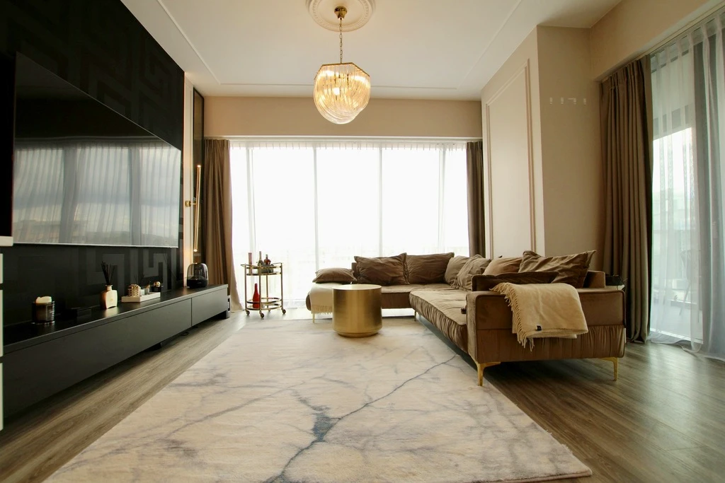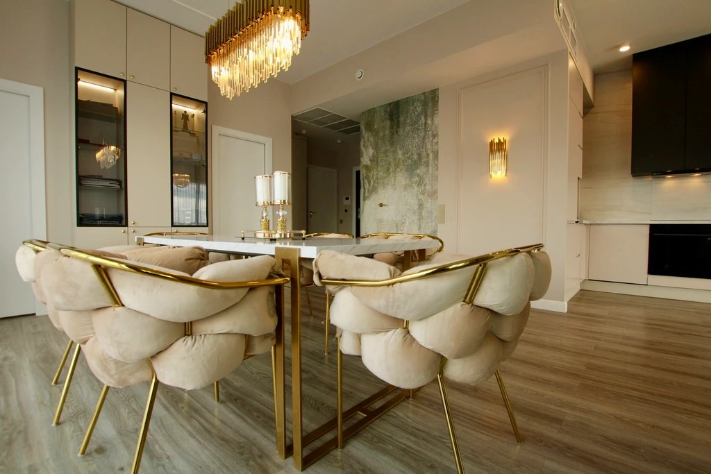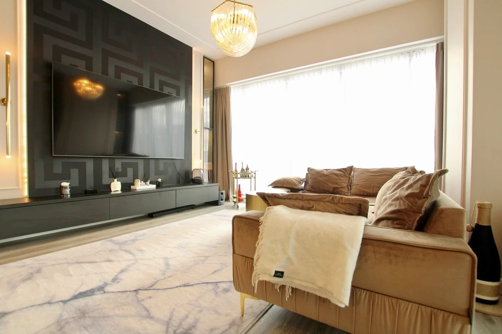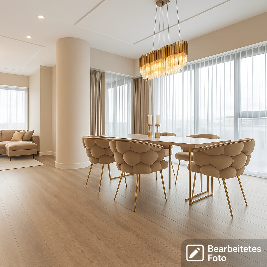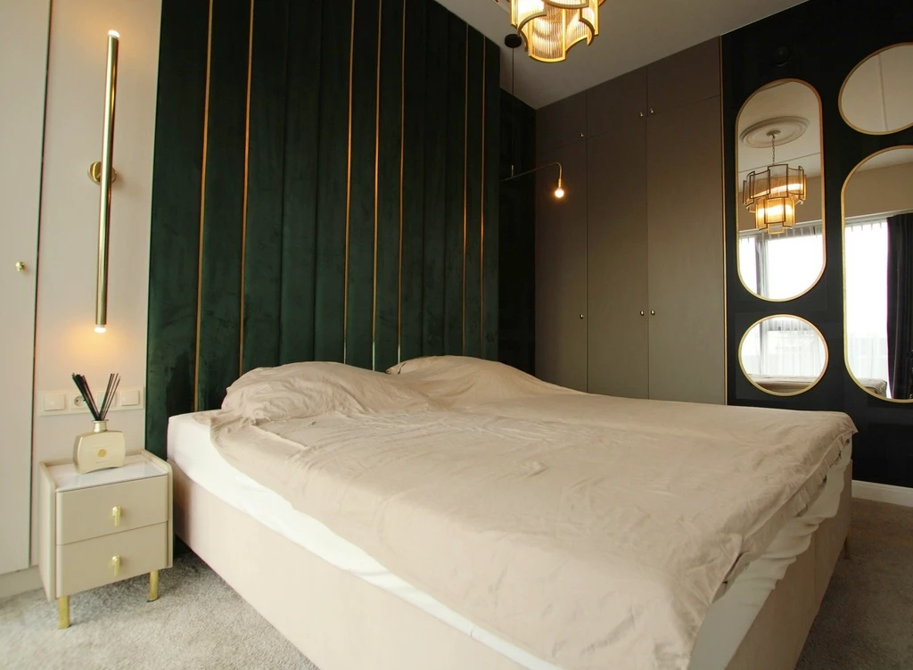 Auf rund 70 m² erwartet Sie ein kunstvoll gestaltetes Apartment im Stil des modernen Glamours mit einem Hauch von Art déco. Edle Materialien wie samtige Stoffe, goldfarbene Akzente, hochwertiges Naturholz, stilvolle Tapeten und Designer-Leuchten sorgen für ein exklusives Wohnambiente. Große, bodentiefe Fenster durchfluten die Räume mit Tageslicht und bieten einen weiten Blick über die Skyline der Stadt.