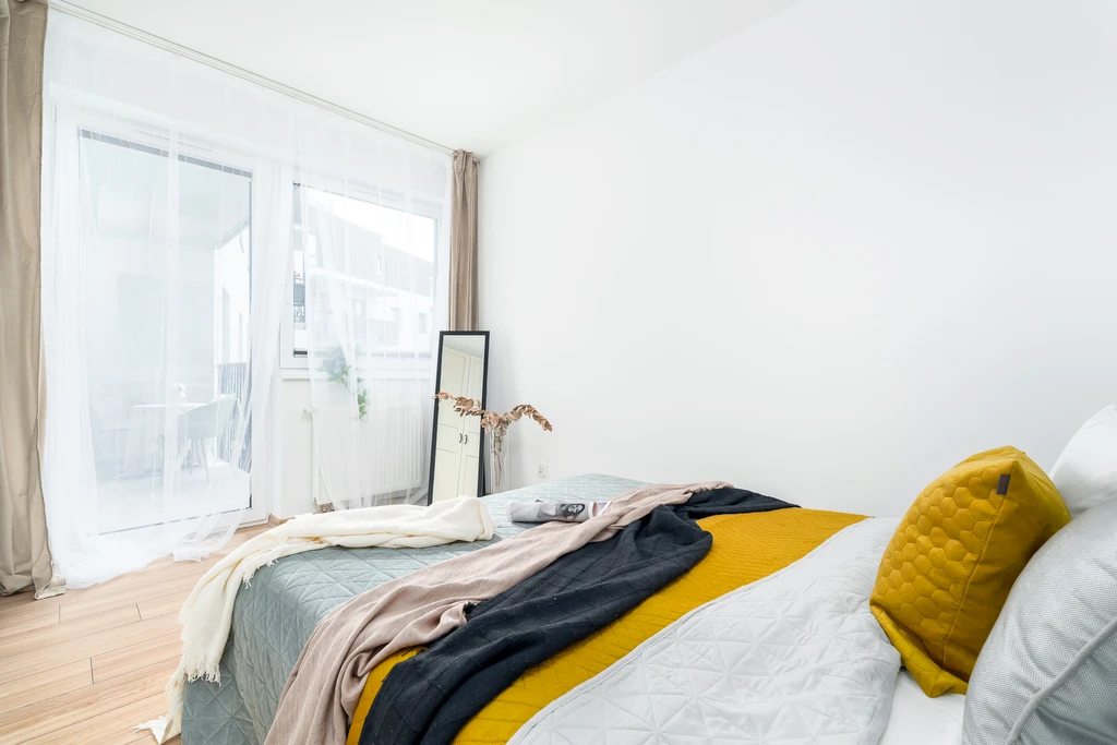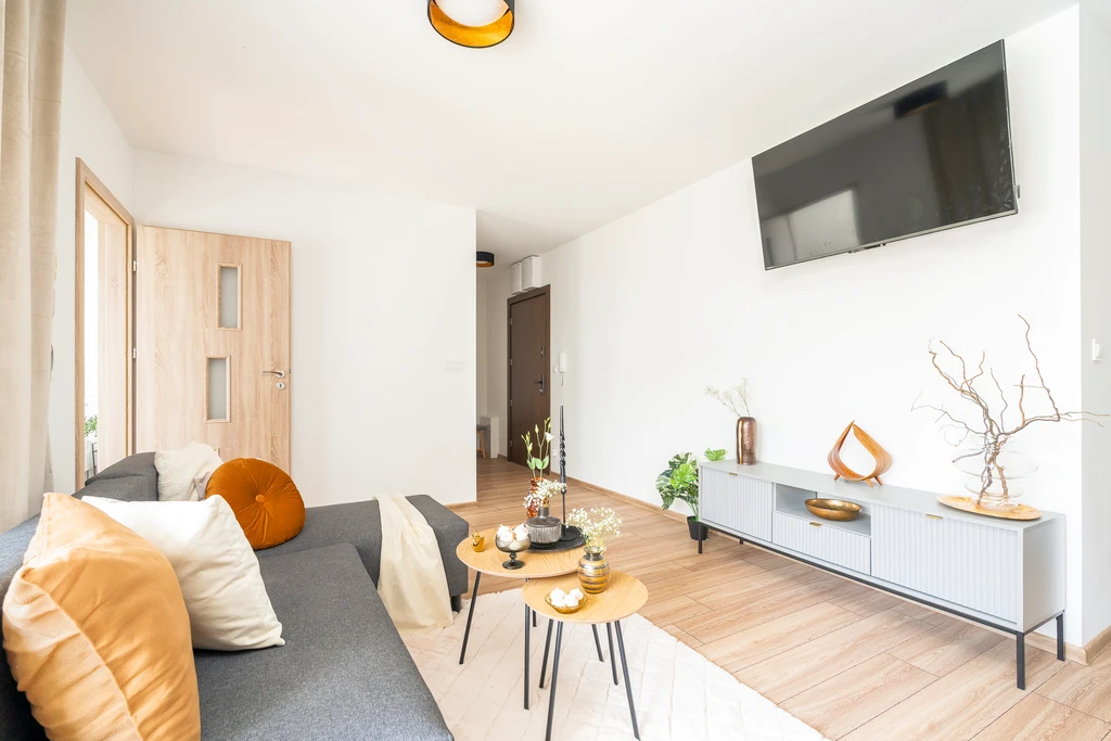 Die Wohnung befindet sich im modernen Apartmenthaus aus dem Jahr 2023 in exklusiver Lage im Stadtteil Wały Chrobrego. Sie liegt ruhig ausgerichtet mit Blick ins Grüne – in der kalten Jahreszeit öffnet sich durch die Bäume sogar ein schöner Ausblick auf die Oder.