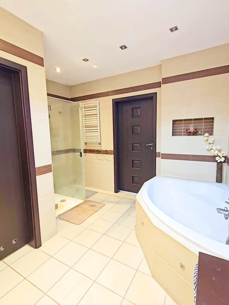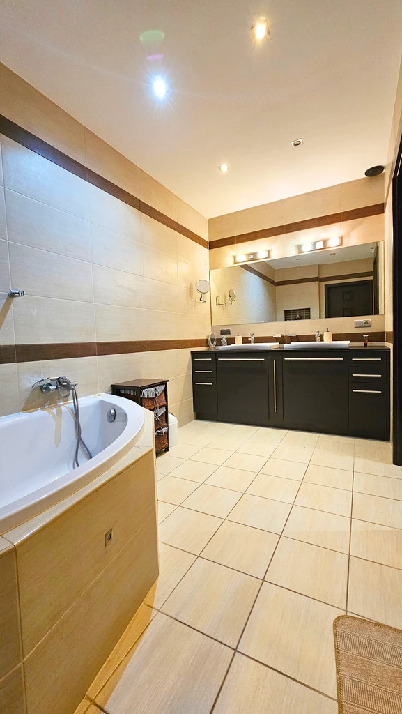 - Badezimmer: Ausgestattet mit Badewanne, Dusche und zwei Waschbecken – funktional und stilvoll