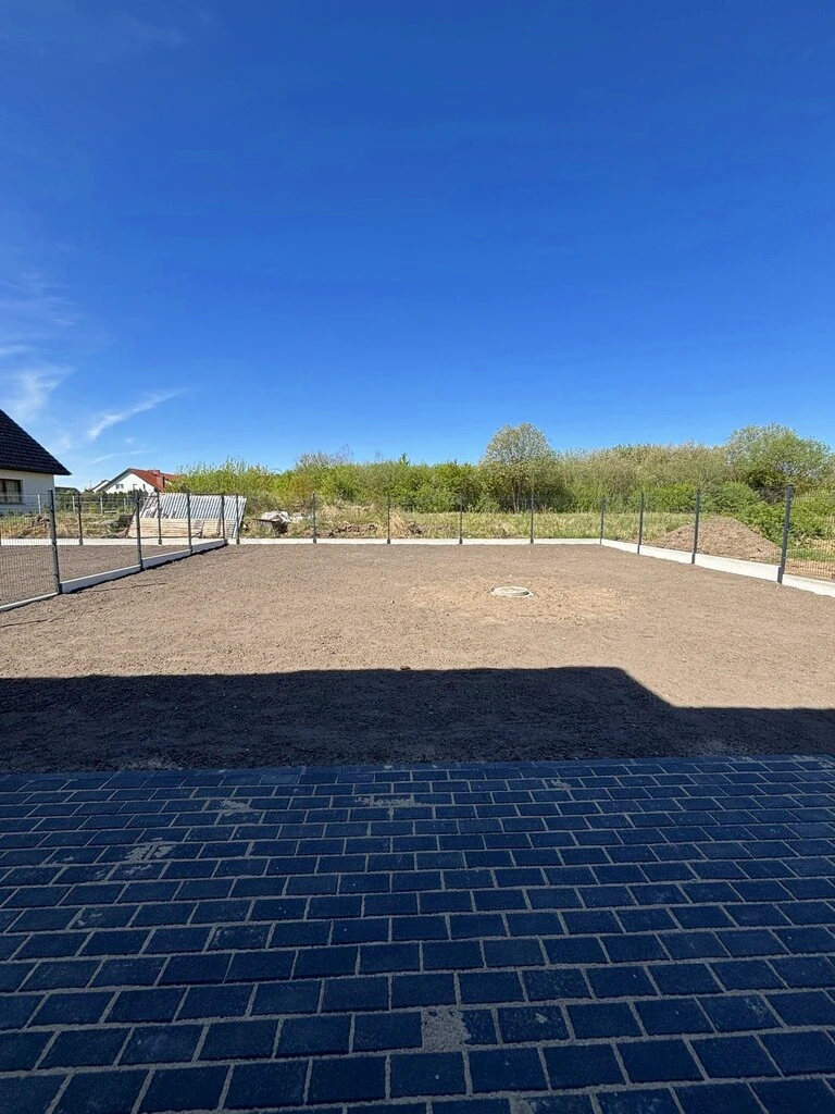 Das Haus liegt in einer ruhigen Wohnstraße, die an das kommunale Straßennetz angeschlossen ist. Die rechteckige Grundstücksfläche von 418 m² ist bereits eingefriedet und bietet einen fertiggestellten Weg sowie einen eigenen Stellplatz und eine Garage.