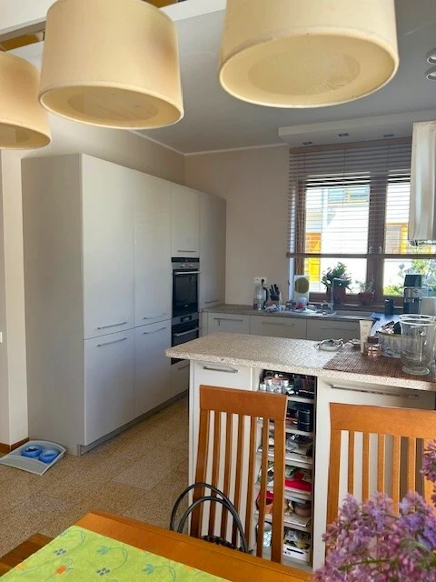 - Essbereich und Küche in offener Gestaltung. Die maßgefertigte Küche beinhaltet moderne Einbaugeräte und eine Fußbodenheizung.