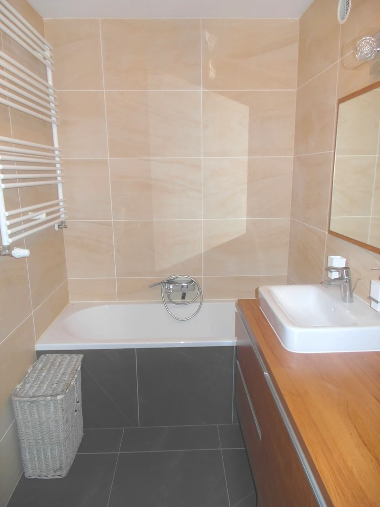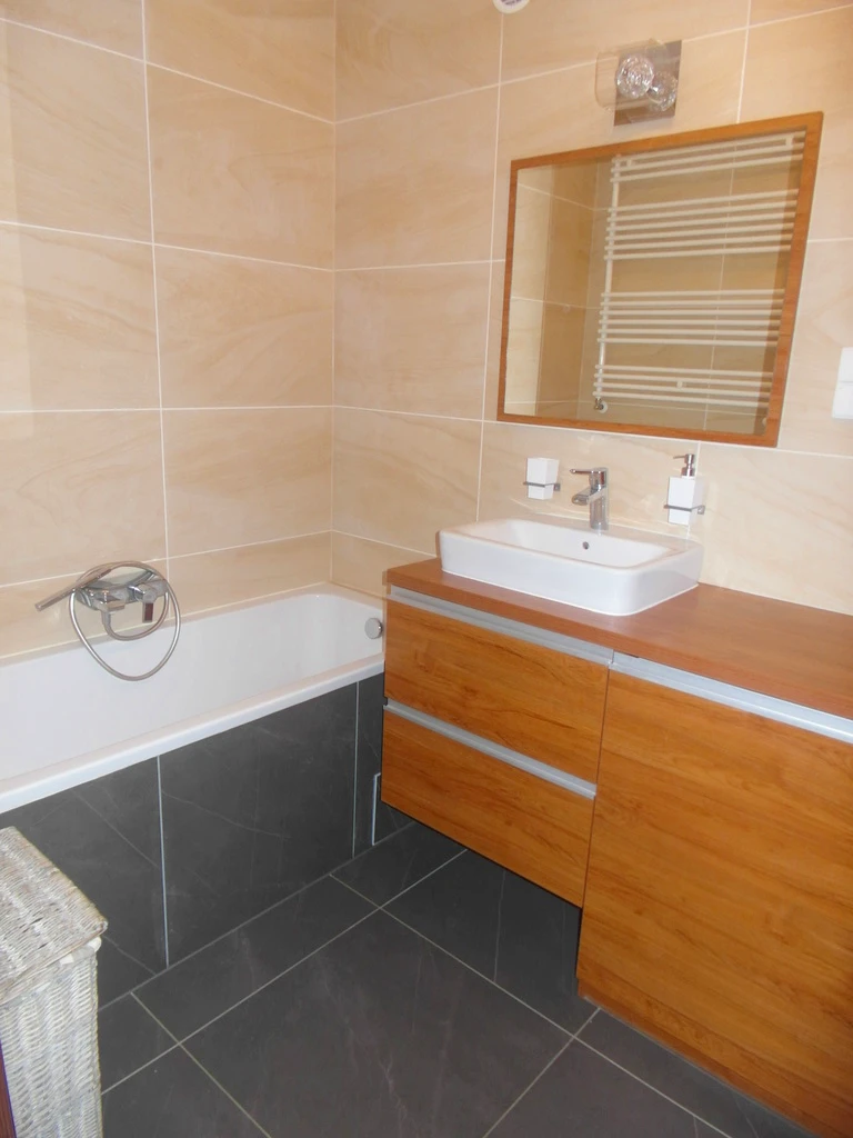- Badezimmer: ca. 5,60 m² mit Badewanne, separater Dusche, Waschbecken mit Einbauschrank, Hänge-WC, Handtuchheizkörper und Waschmaschine