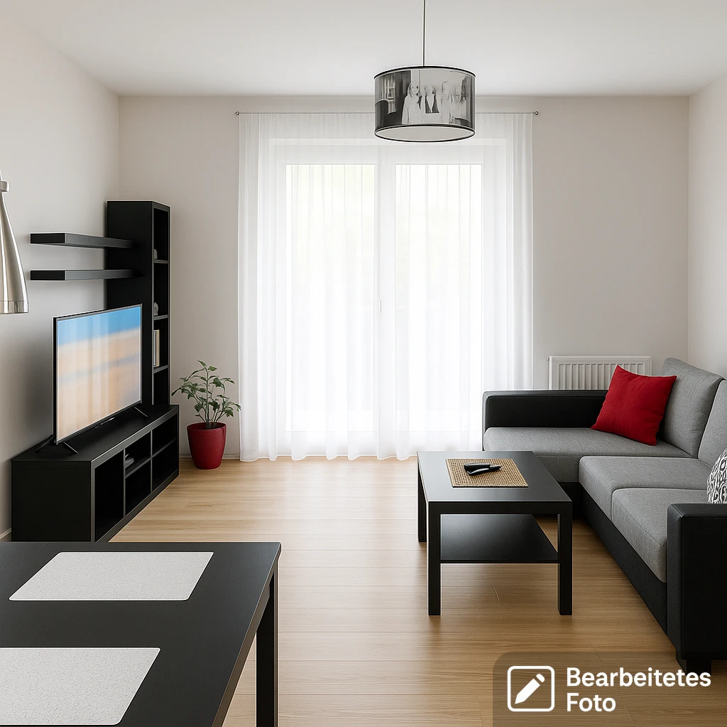 Optional kann ein Teil der Möblierung übernommen werden, darunter ein ausziehbares Ecksofa, Couchtisch, Esstisch mit sechs Stühlen sowie ein TV-Tisch im Wohnzimmer.