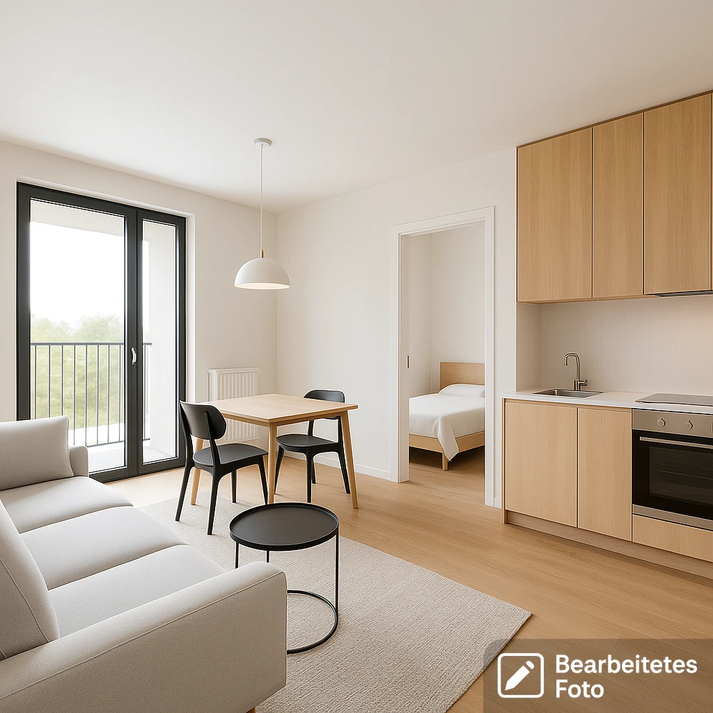 Raumaufteilung: - Offener Wohnbereich mit moderner Küchenzeile: 23,03 m² - Geräumiges Schlafzimmer: 16,83 m² - Badezimmer: 3,75 m² - Flur: 5,42 m² - Balkon zur Südseite: 9 m²